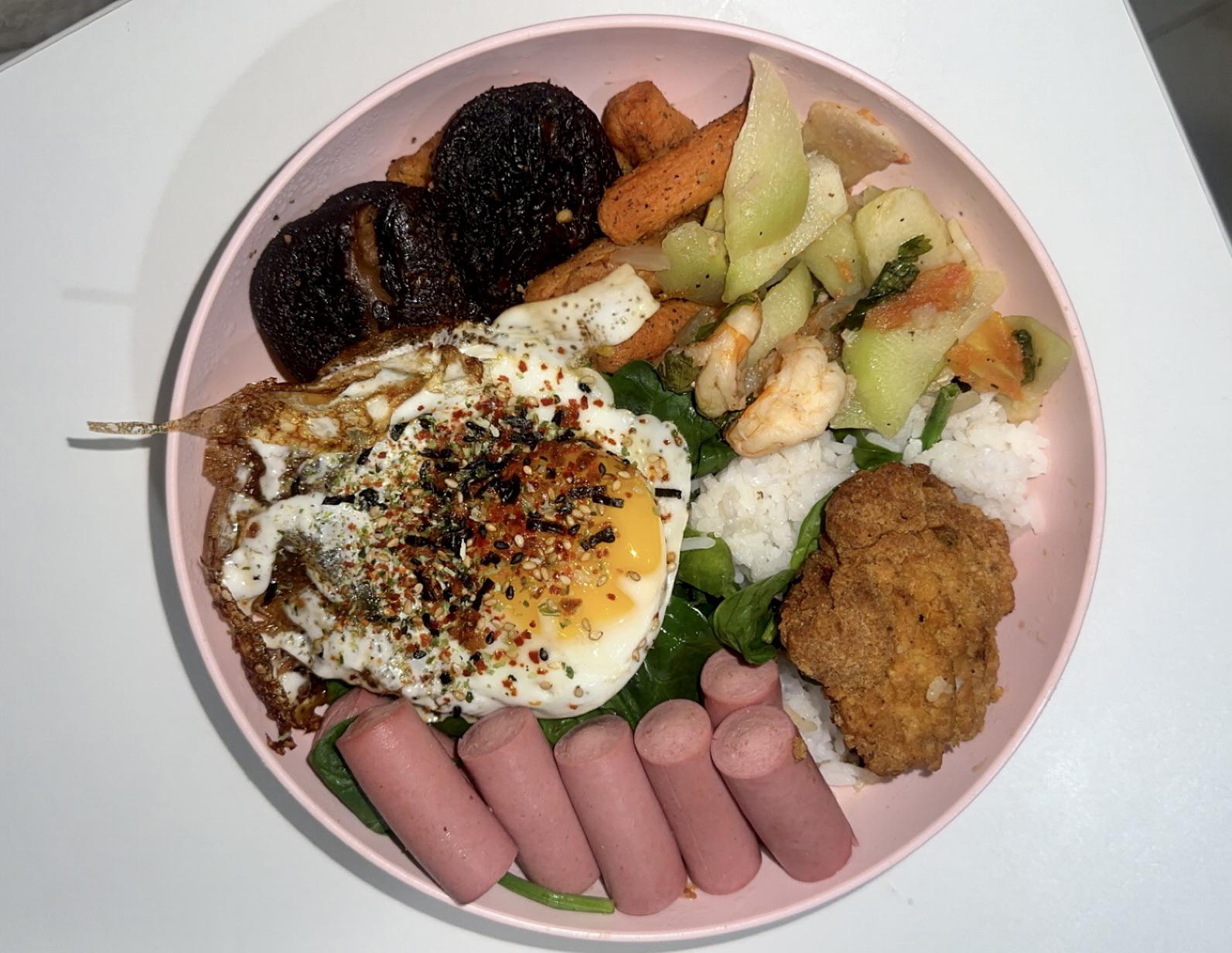 Vienna sausages, air fried veggies, sautΓ©ed cayote w/shrimp, half eaten chicken tender on a huge bed of rice with spinach sprinkled into itβ¦ for health π₯ oh yeah yeah and a fried runny egg!