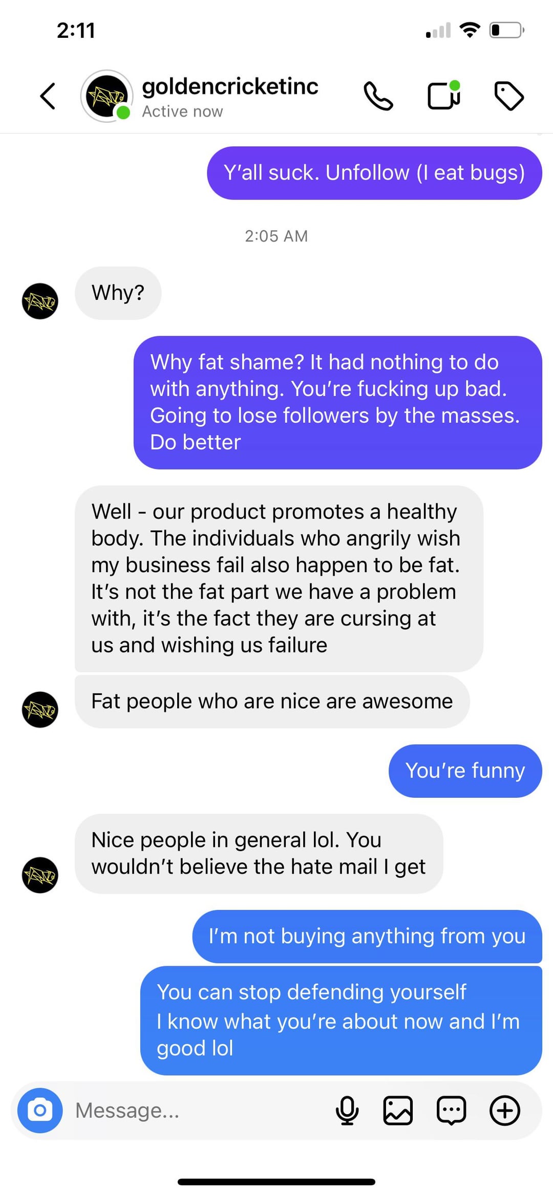 So instead of the correct analysis of “I will not eat the bugs” being a common catchphrase of conservative losers that fear the ~globalist agenda~, they’re just calling them fat? lol