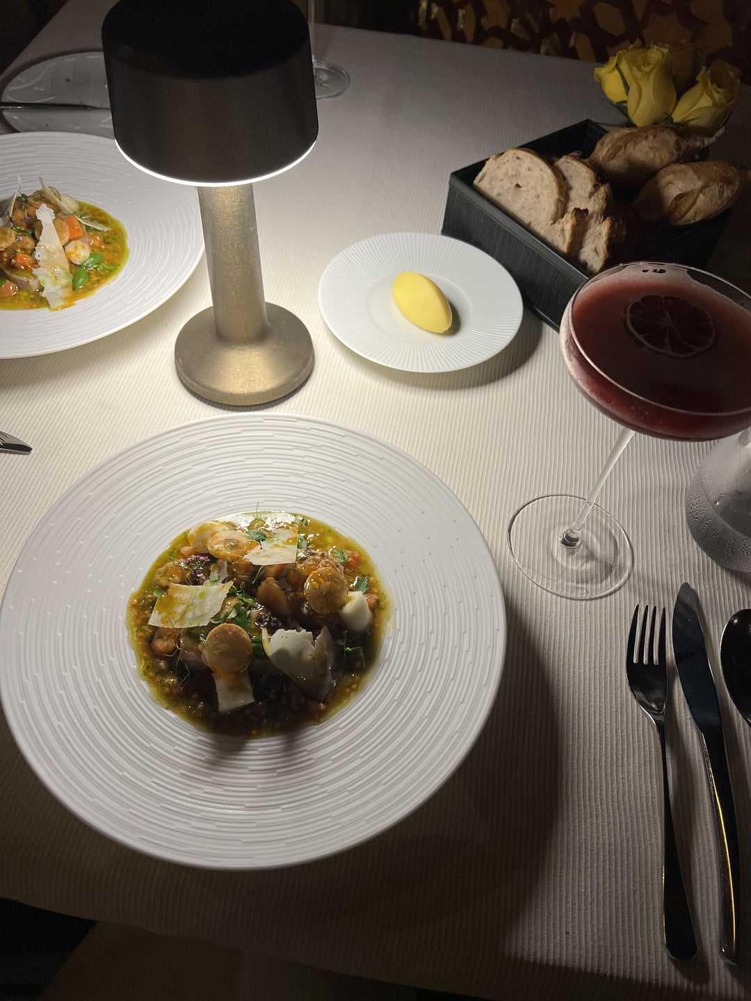 This is one of only two restaurants in Dubai that has 2 michelin stars. Overall very enjoyable; just traditional French Haute Cuisine with no gimmicks or surprises. The restaurant interior is ofcourse lavish, and upon entry we were met with a warm towels and taken to our table. We opted for the 4 course “emotion” menu without wine pairing instead opting to order cocktails.