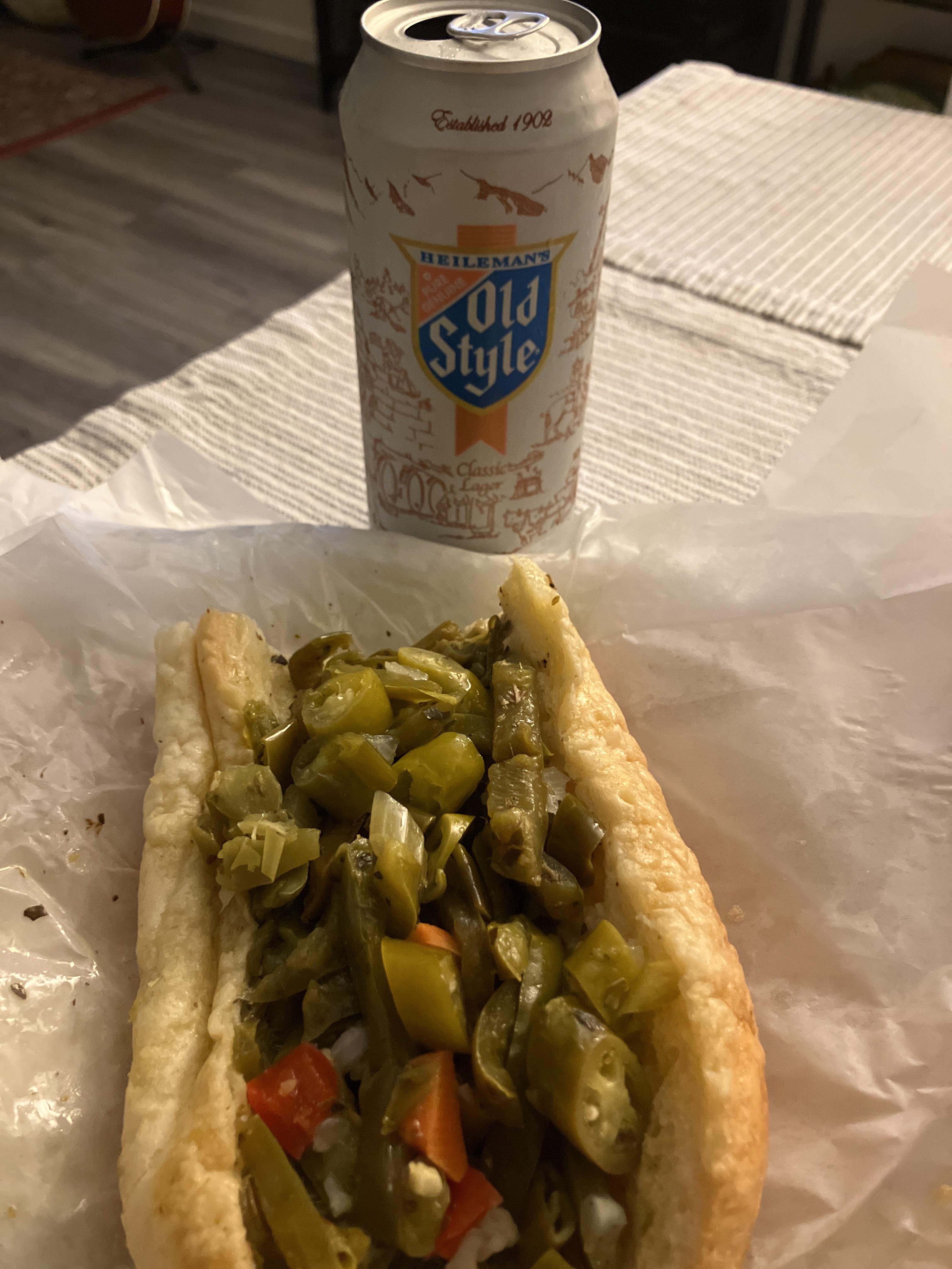 Dry sweet pepper sandwich on french bread with hot giardiniera peppers and a pint of Old Style lager beerby bbb149 Write A CommentYou must be logged in to post a comment.
