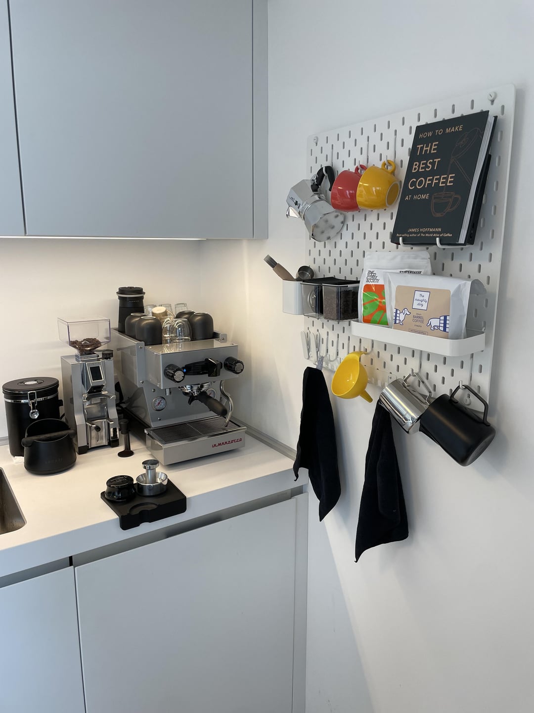 Second picture: • SKÅDIS Pegboard from Ikea • Moka pot is from Bialetti • Coffee beans are from my local coffee store in vienna • The brush is from econized (Amazon) • Book is from the one and only James Hoffmann