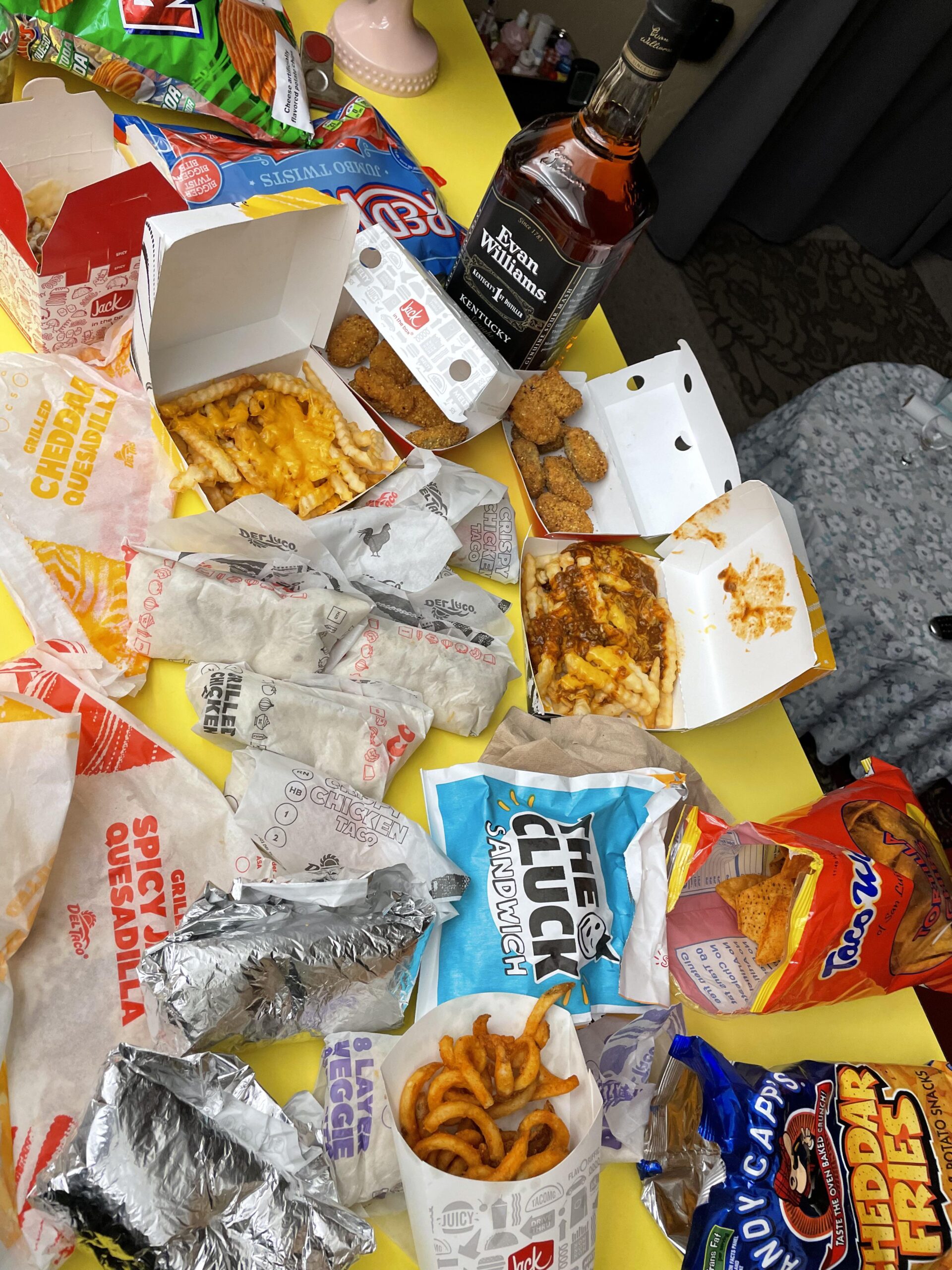 Taco Bell + Jack + Gas Station snacks and bottom shelf Bourbon.
