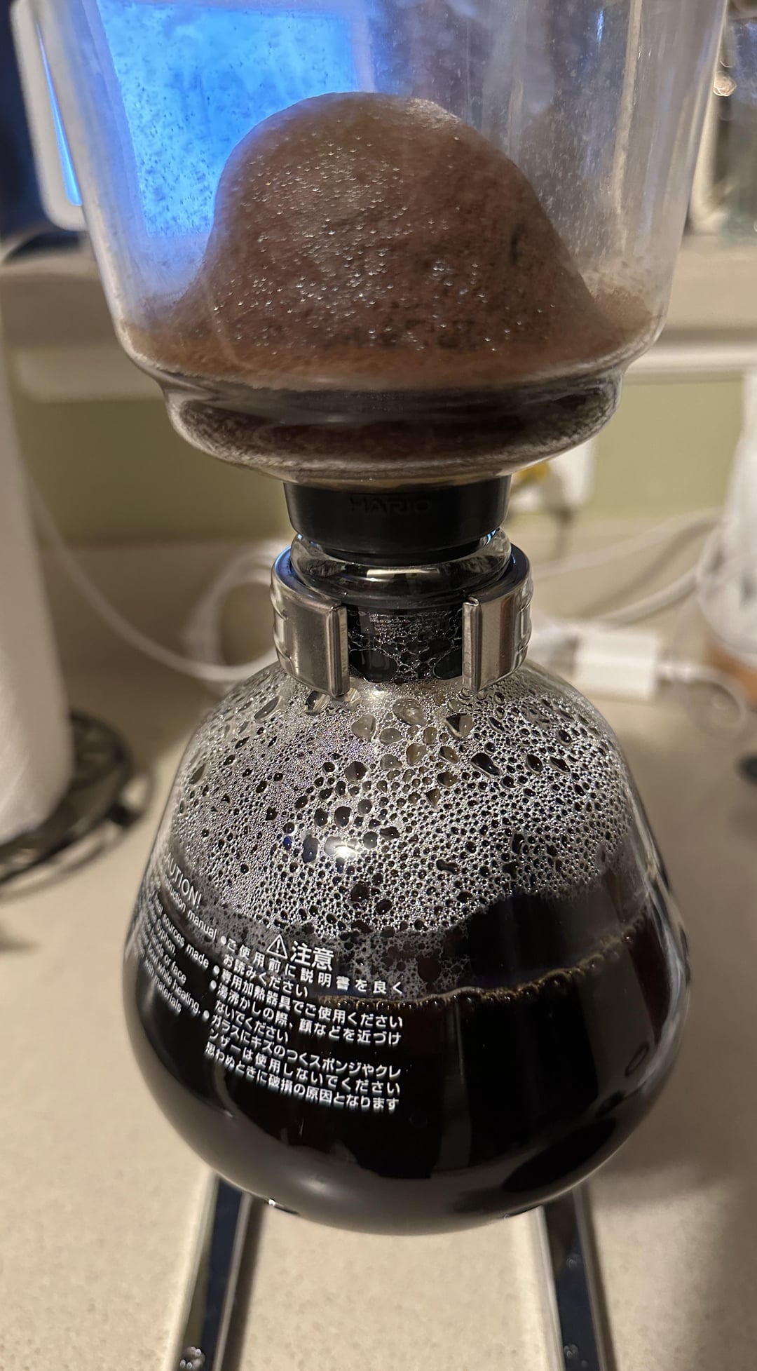 I then poured my coffee in and gave it a few quick swirls to make sure everything was saturated. I put the lid on, and let it steep for about 90 seconds. I then removed the heat source completely, and gave a few more quick stirs. After about 15 seconds or so, the bottom chamber cooled enough to where the reverse vacuum action was initiated and filtered down into the bottom chamber. That drawdown took about 30-40 seconds.