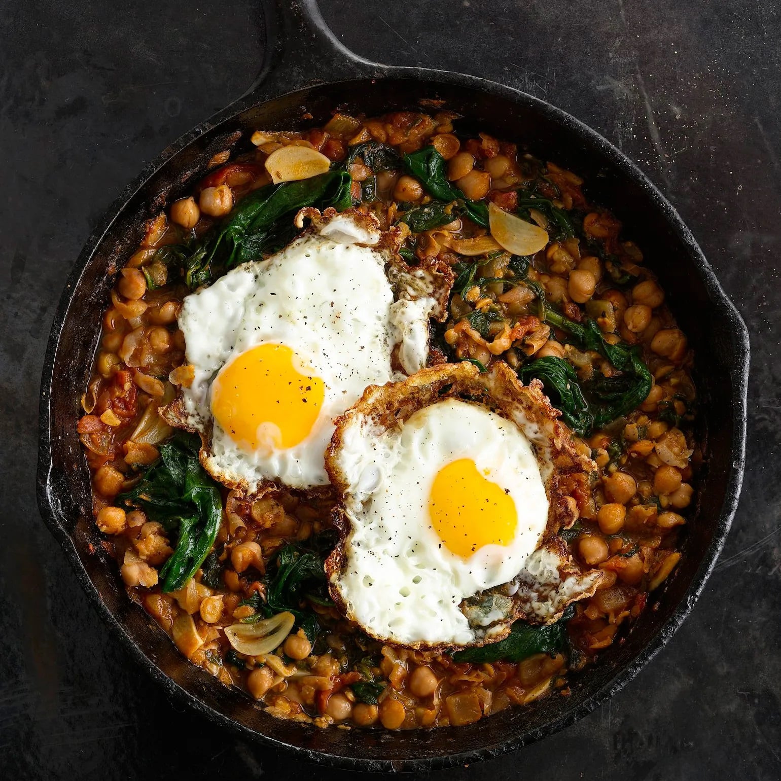 13. Spoon chickpea stew into bowls and top each with a fried egg.