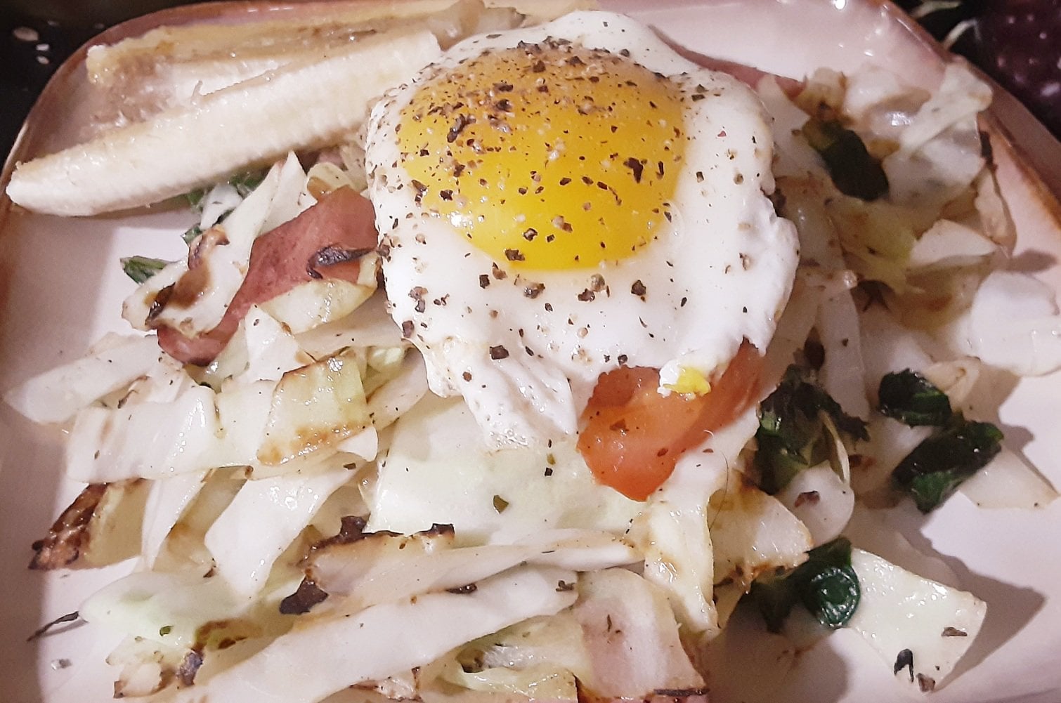 Fried greens, cabbage, tomatoes, and spam topped with a yellow fellow by Fragraham Write A CommentYou must be logged in to post a comment.