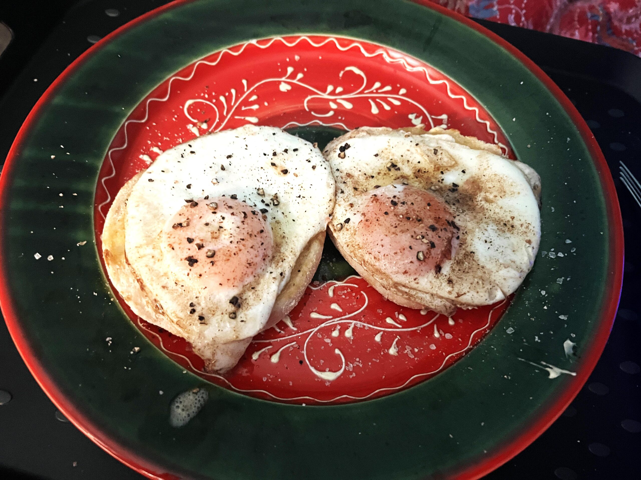 Delicious lunch. Toasted and buttered English muffins with eggs cooked in brown butter.