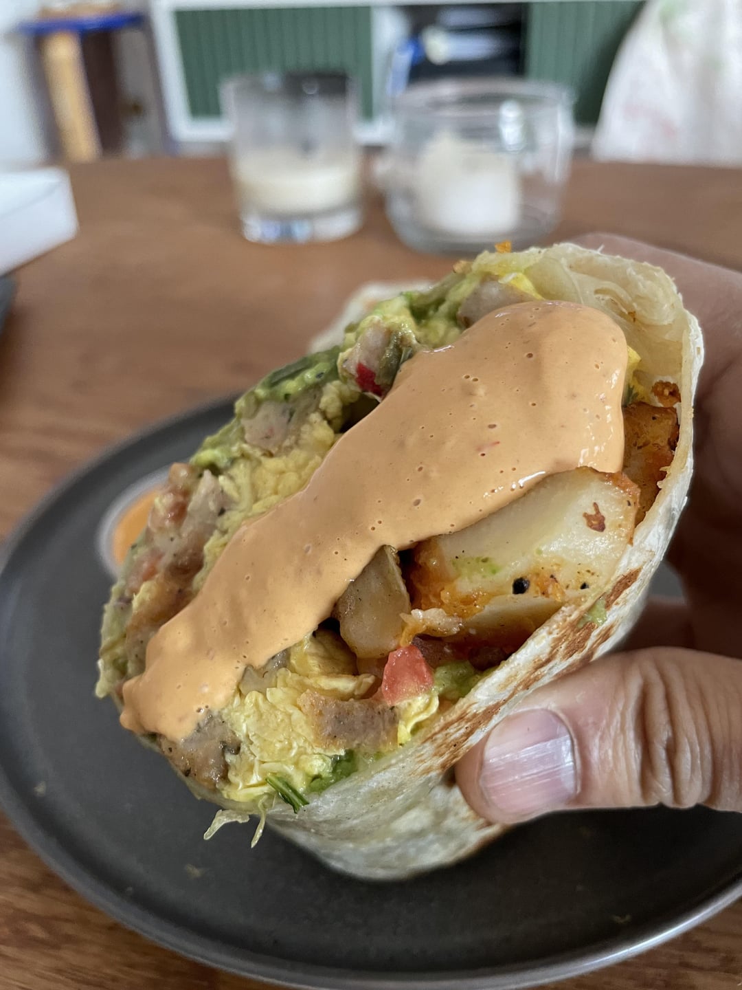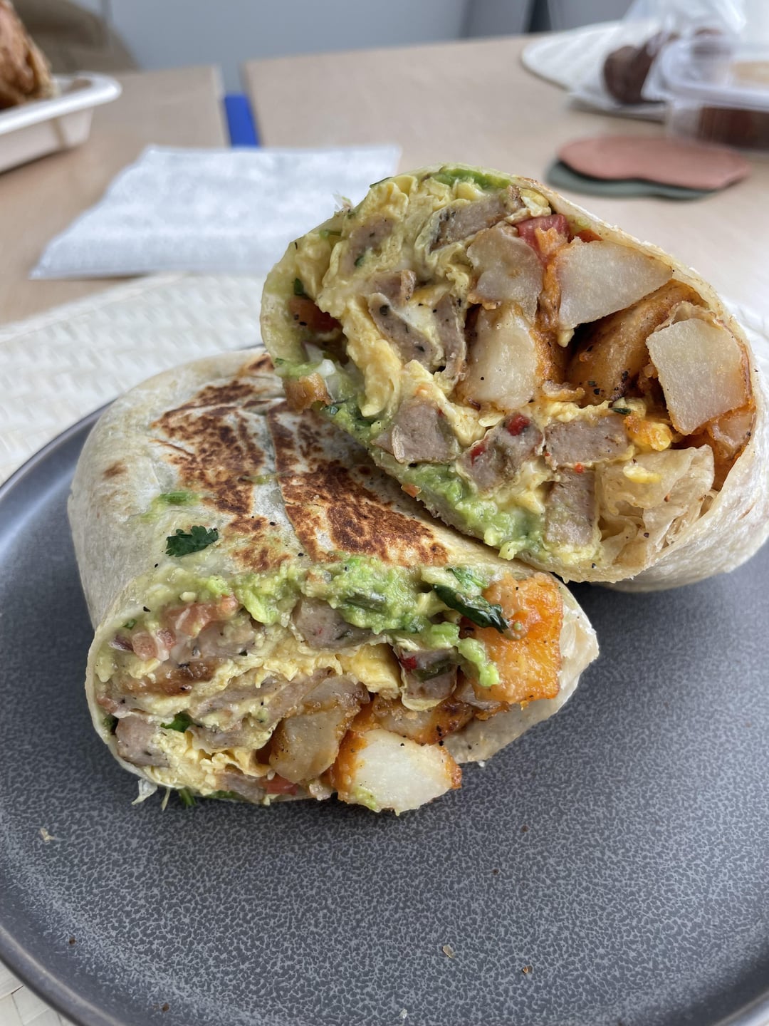 Added sausage, no beans. This was heavy on the potatoes, and though I prefer crispy hash browns the potatoes were seasoned really well. I liked how tightly the burrito was wrapped and it was also grilled. The orange sauce was fire so next time I’ll ask for extra. Fresh avo gave it a nice balance.