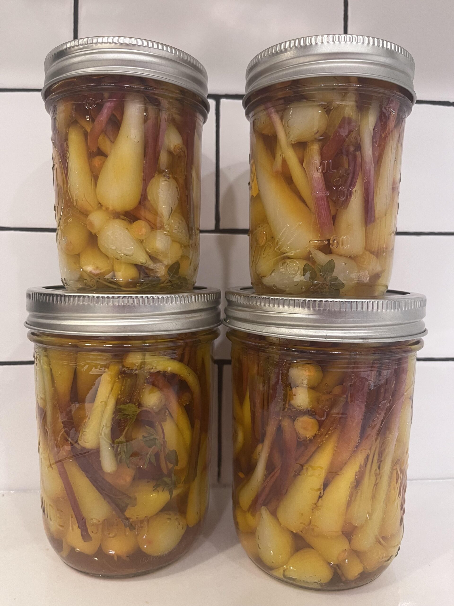 Ramps are Wild onions/leeks that can be foraged in the spring in the Appalachian mountains, they grow on my property so I am lucky to be able to sustainably harvest them! I mostly added the pearl onions to fill in the empty spaces between them and add a some bulk. Recipe: https://honest-food.net/pickled-ramps-recipe/