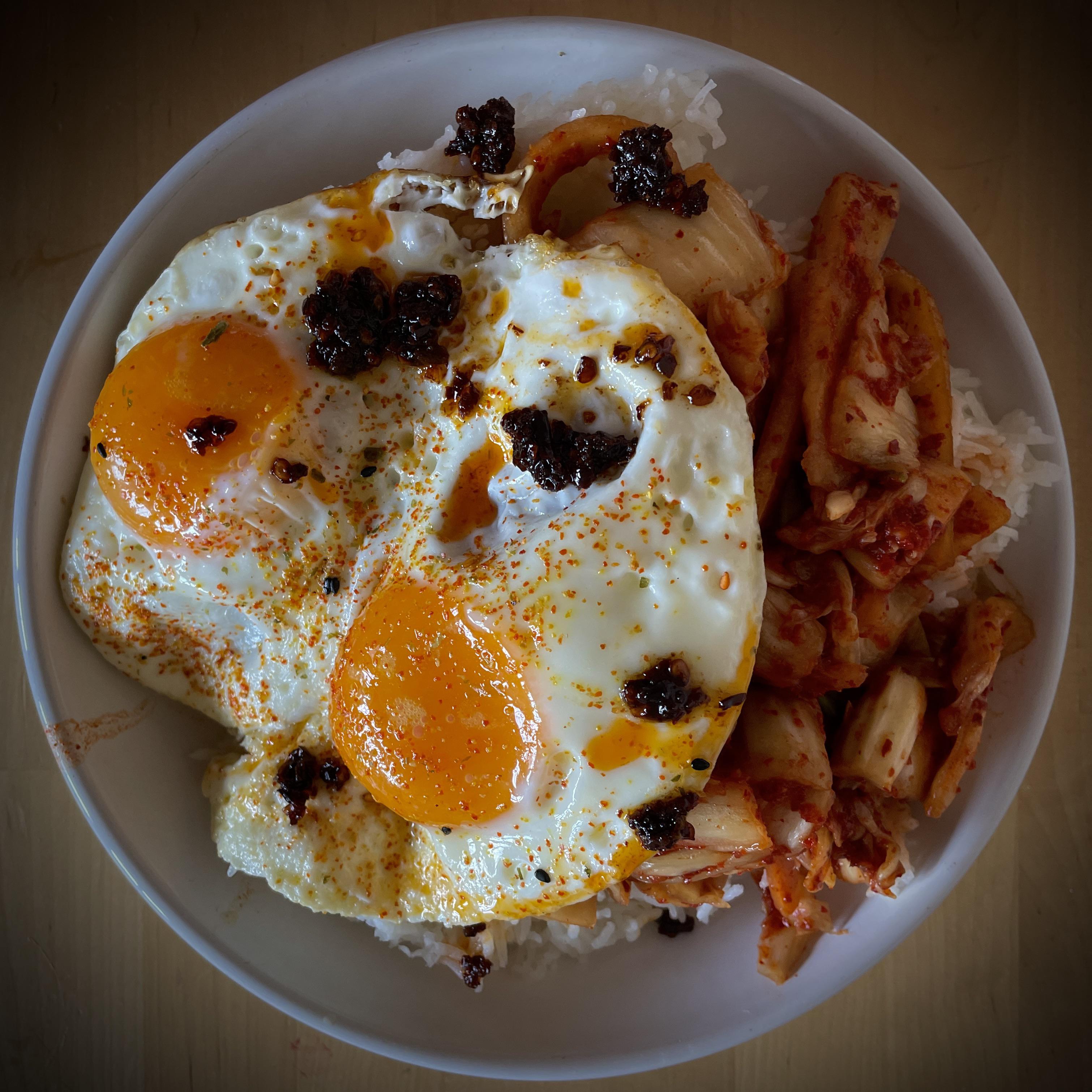 Just straight up rice with kimchi and a couple of cheeky eggs on top? I like it.
