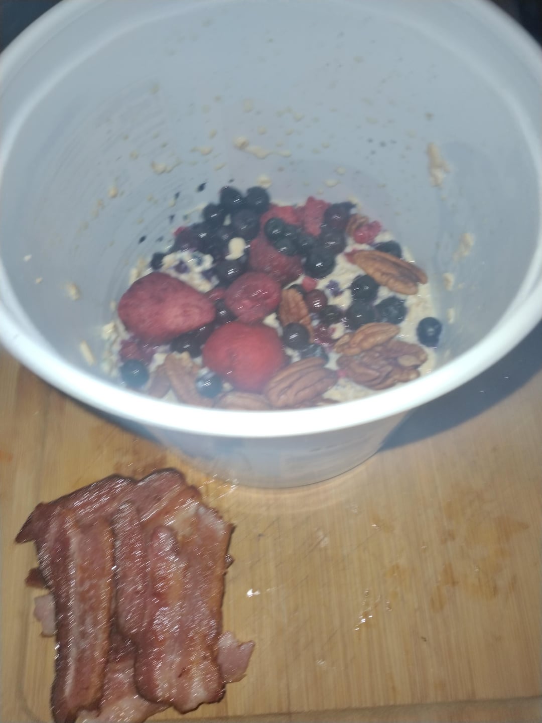 (This is future me after typing all this up and picking pictures: I did find a picture of my oatmeal that I ate with bacon. Apparently that day I didn’t mix everything together haha. Also, side note for anyone wondering: protein foods help lower the glycemic index from carbs, which I’m not sure if it’s protein in general or just high protein foods.. but I had some bacon and I wanted bacon haha and it couldn’t hurt if it helps me not get diabetes! That’s why I ate bacon with my oatmeal that day lol)