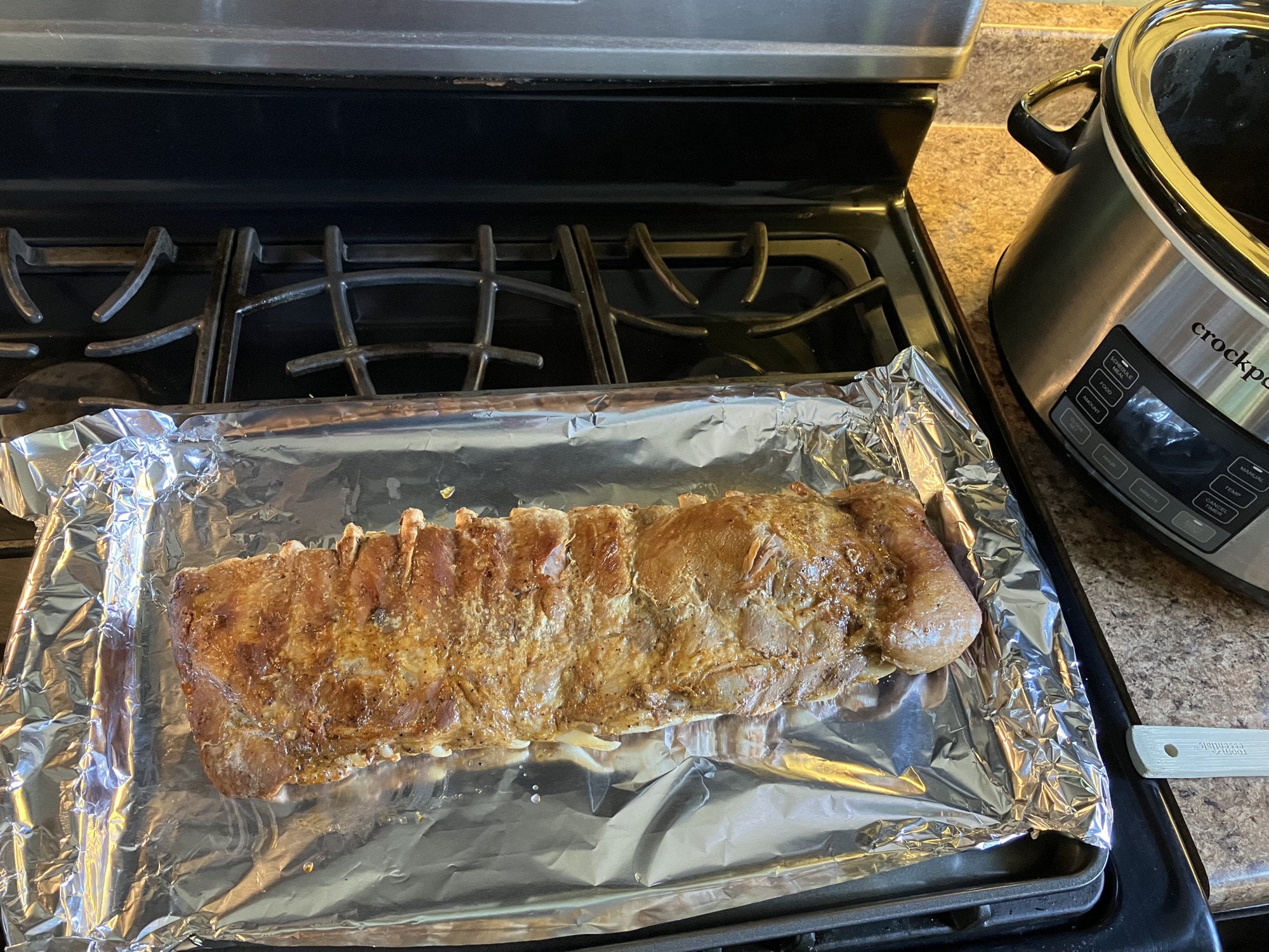 Recipe: St. Louis spare ribs. BBQ rub and 4 hours on high in the crockpot. Then baste with hot bbq sauce and broil for a few minutes to get a nice crust.