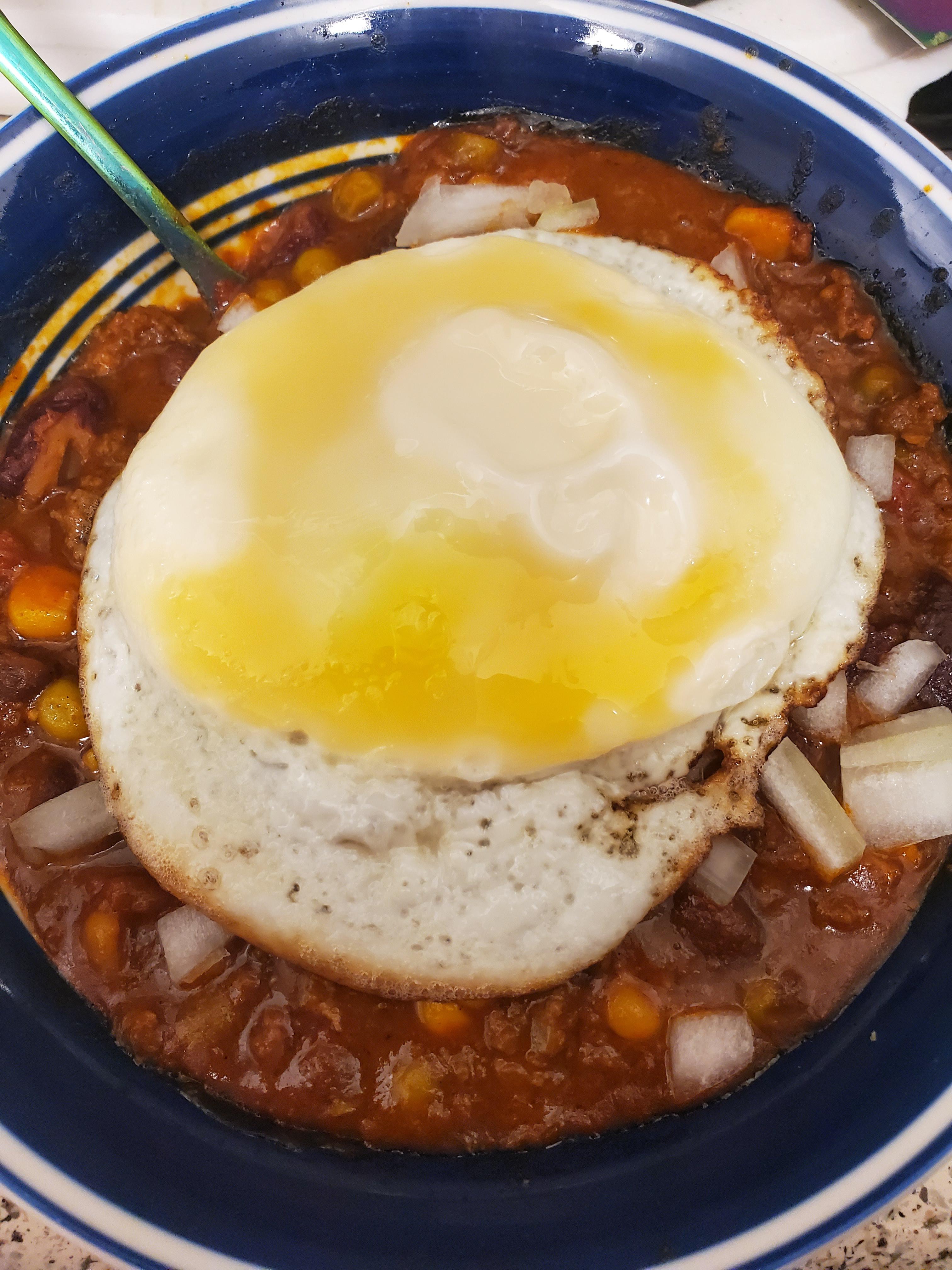 Egg on chili! by MythicalGrain 3 Comments xMrSanchox 3 years ago Trying this thanks jzilla11 3 years ago I sometimes put leftover chili over a simple cheese omelette, good winter breakfast. Should try this soon SimpleVegetable5715 3 years ago Snowed in and this looks perfect! Thanks for the idea!Write A CommentYou must be logged in to post a comment.