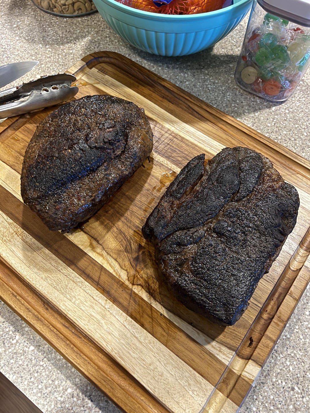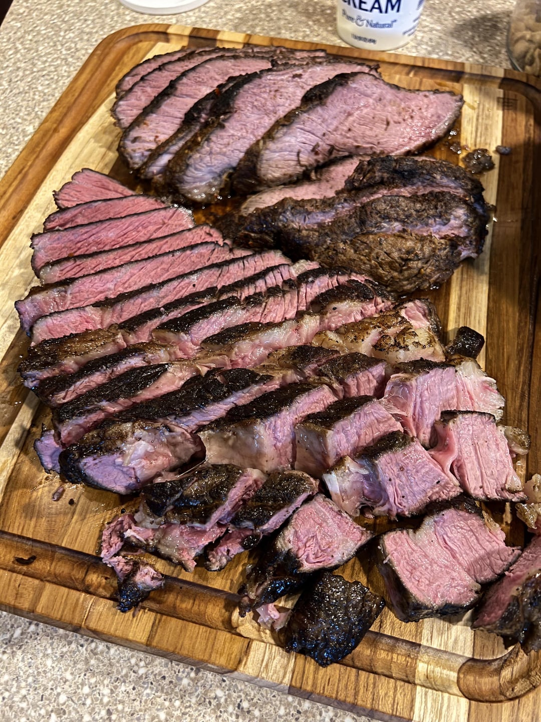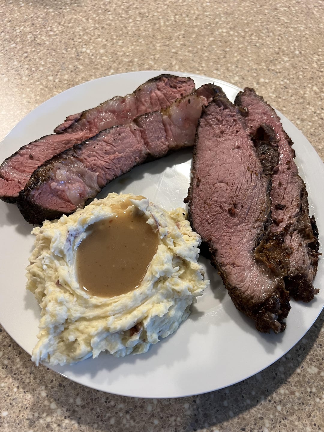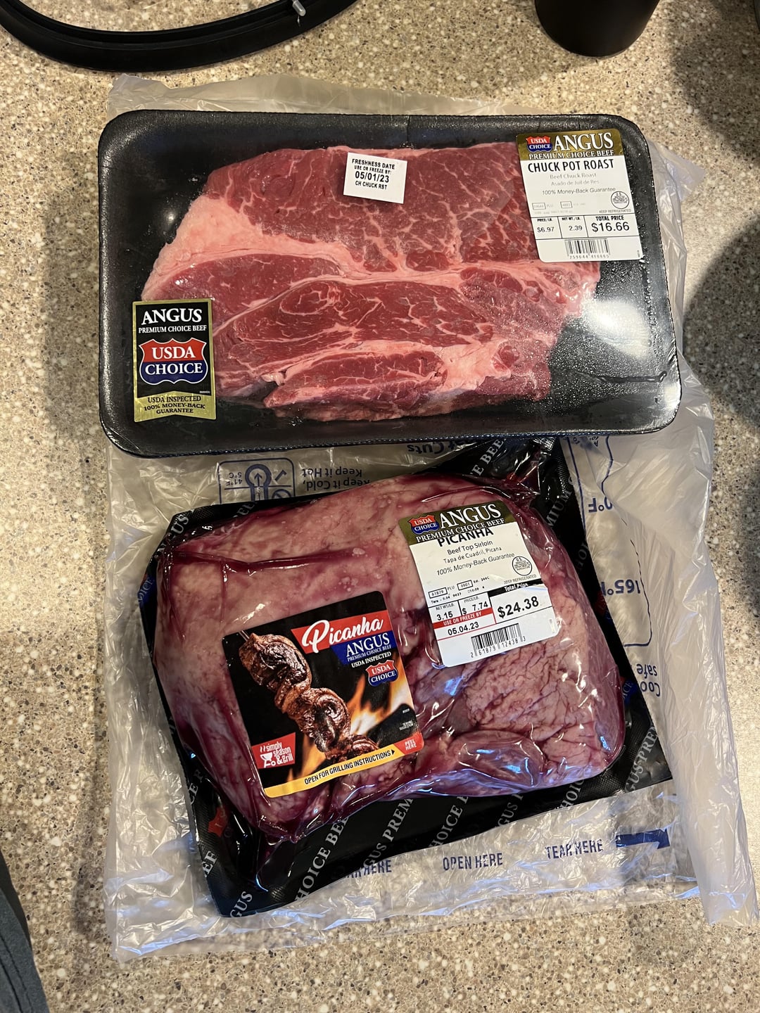 24 hours at 135° was the plan for the chuck, based on recent popularity here. The Picanha happened to be right next to it in the case, so I threw it in there too. 3lb Picanha, 2lb chuck. Picanha fat cap wasn’t super thick and is on the bottom in the pictures. Cast iron sear and some gravy from the drippings to finish off the project. Both cuts turned into prime rib over night. New favorite cheap meat cook!!