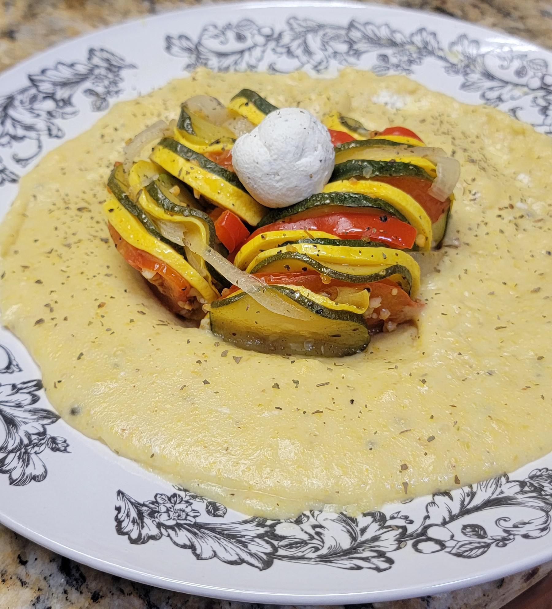 I’ll tell you how I plated it, but you can do it however you want. I drained the excess liquid from the ramekins and placed them upside down on the plate. I poured the polenta around the ramekins and removed the ramekins. The polenta surrounded the ratatouille and I topped each plate with a bit of goat cheese and basil.