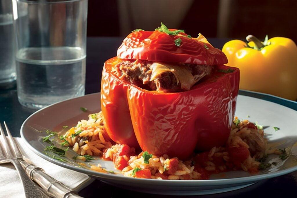 8. Stuff the bell peppers with the rice and meat mixture. Place these peppers in a baking dish and surrounding them, spoon any additional stuffing mixture.