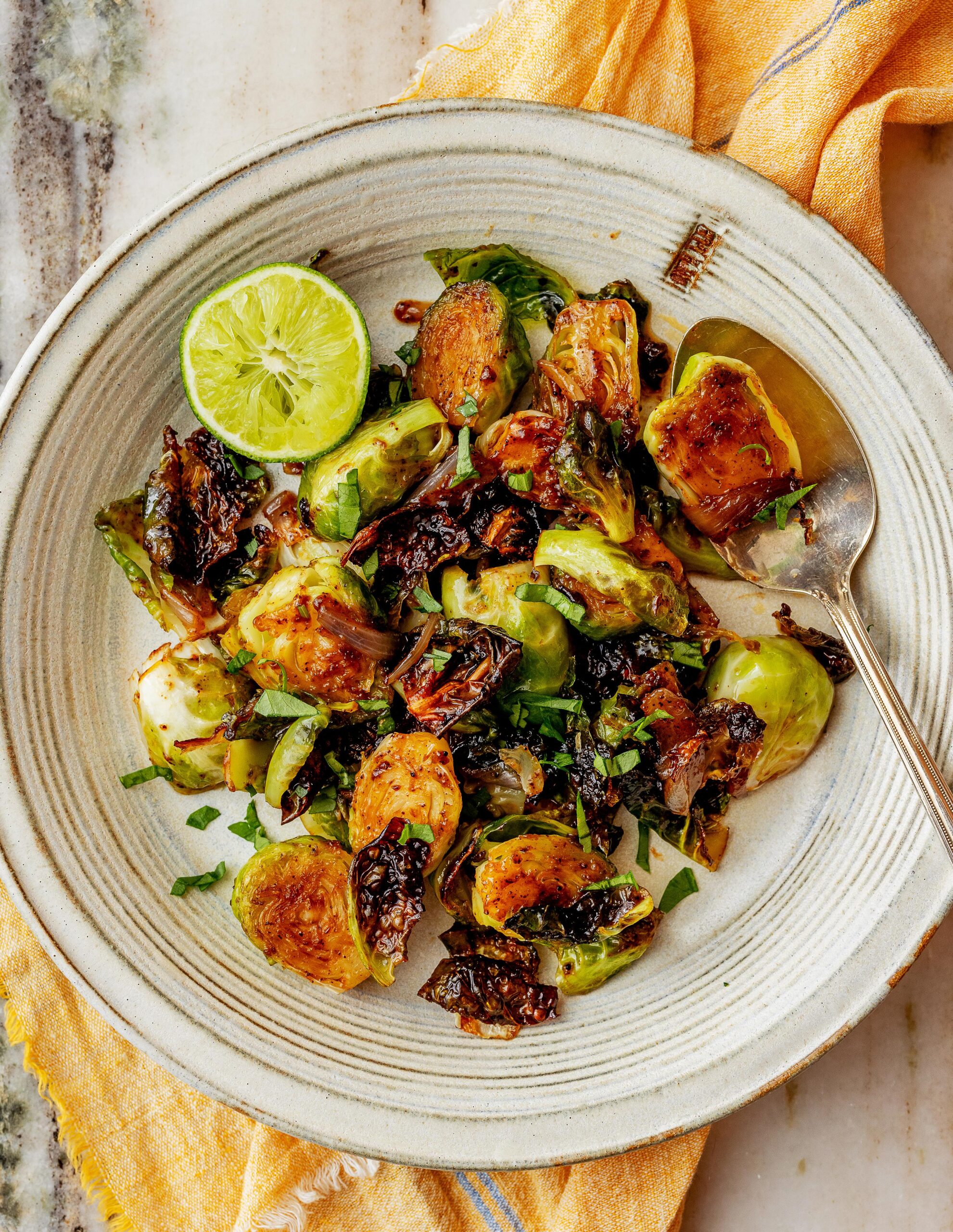 * 16 ounces Brussels sprouts, trimmed and halved * 1 shallot, peeled and sliced into wedges * 2 teaspoons neutral oil * 3 tablespoons butter * 1 tablespoon ancho chili powder * 1/2 teaspoon cayenne powder * 1 tablespoon maple syrup, more or less to taste * 2 teaspoons white miso paste * Salt and pepper to taste * ½ lime, juiced * Minced cilantro, for garnish