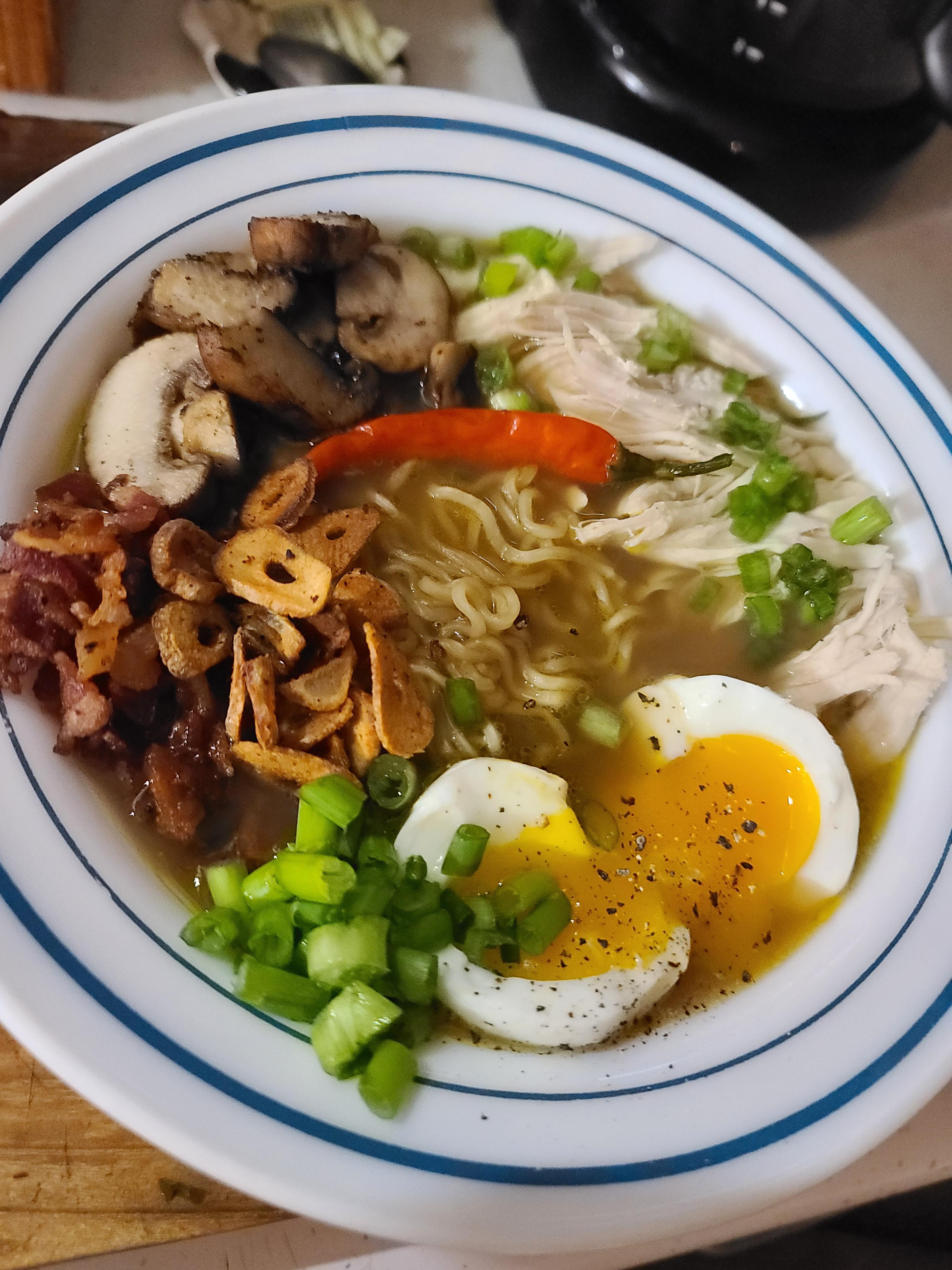 Rotisserie chicken ramen with homemade 8hr broth, 5 minute egg, bacon, mushrooms, and fried garlicby XRPcook 7 Comments SigmaGamahucheur 3 years ago The pepper is a nice touch chefs kiss I’d start by eating it then have the egg. thekleave 3 years ago That’s one good looking egg! The ramen doesn’t look bad either!! Enjoy! thorluv1 3 years ago This looks so delicious 🤤. I definitely have to make some ramen sometime this week. peach_burrito 3 years ago Oooooh damn. Yummy Marty1966 3 years ago Recipe for the broth? This looks outstanding! peebottle8883 3 years ago Wow, I want some! The fried garlic is a beautiful touch. MillieBlack2 3 years ago looks super yummy, I’d eat this while drinking my Gfuel for dinnerWrite A CommentYou must be logged in to post a comment.