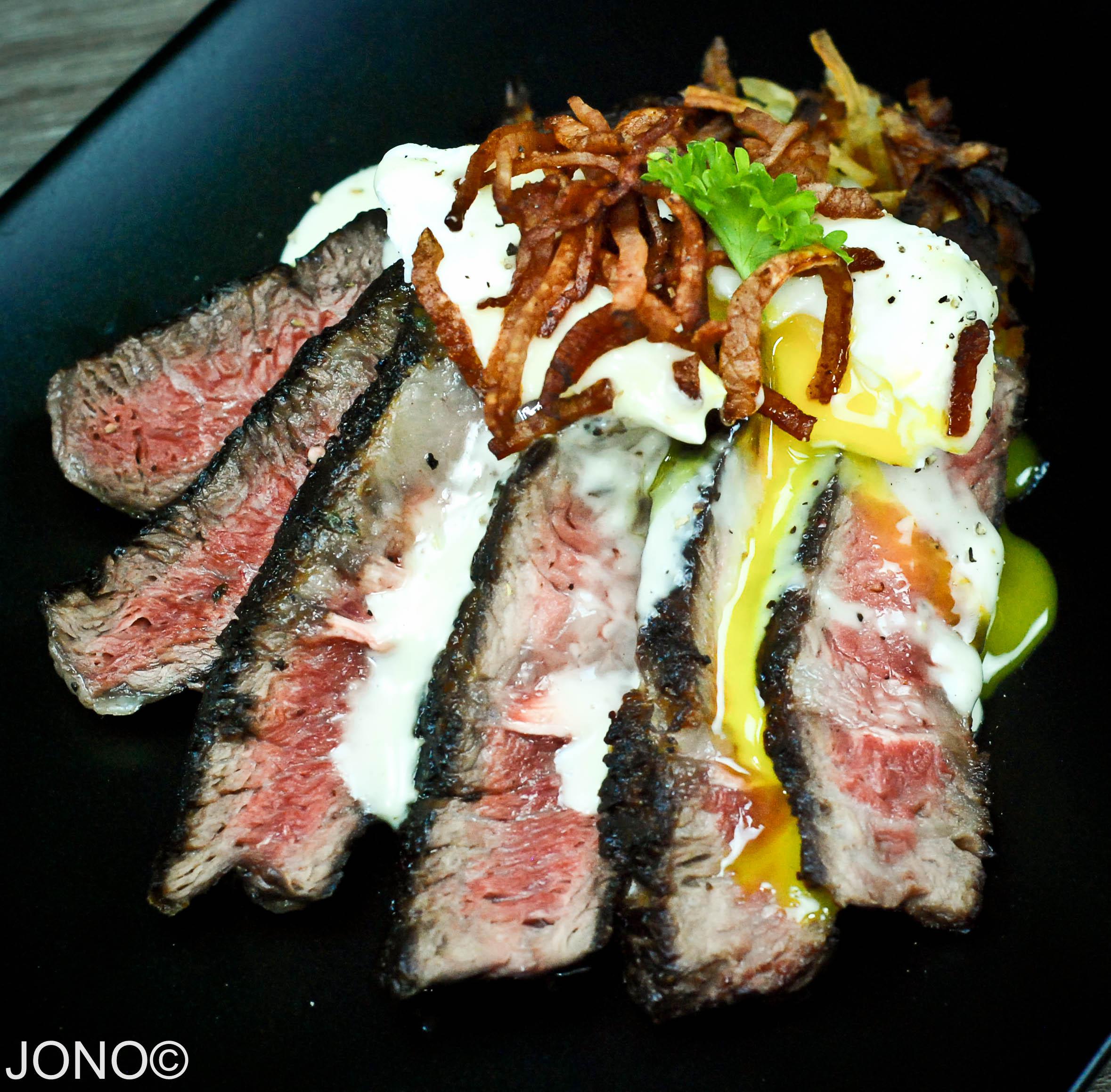 Breakfast: Leftover Ribeye, Rösti, Jalapeno Queso, Crispy Canadian Bacon & Egg
