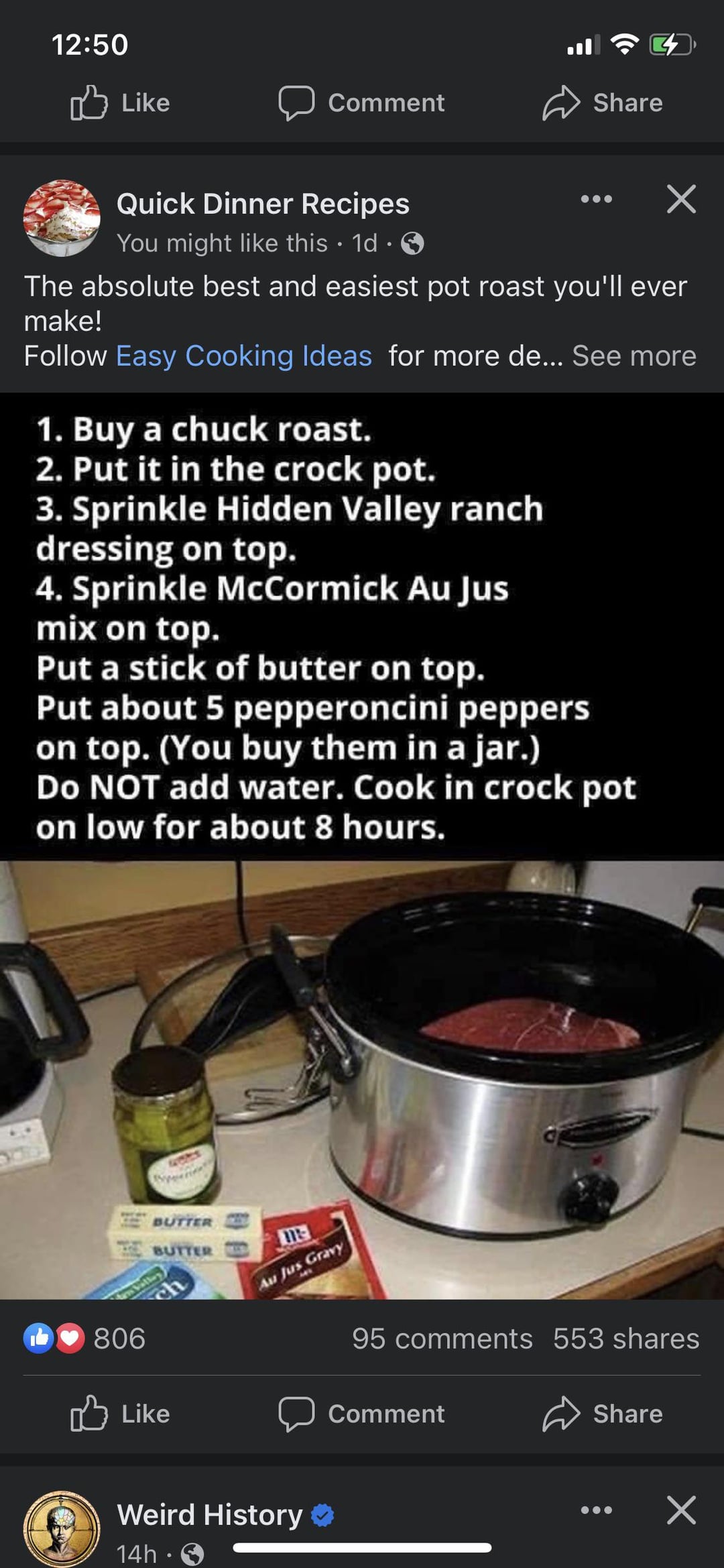 For the actual recipe, that looks to be very similar to a Mississippi pot roast. It’s a love it or hate it type dish, not many people think it’s just “meh”. Just wanted to point that out if that you’re disappointed, try a different roast recipe – I’m personally in the hate it category
