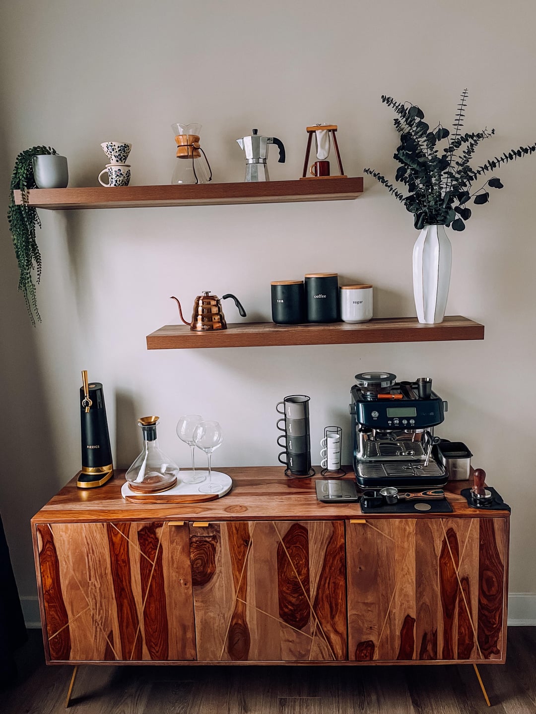 PeeThenPoop 3 years ago – Breville barista pro – Etsy portafilter – Home Depot buffet table – Home goods cups – random wooden tamper – Costa Rican chorrero – French press – Chemex – Colombian pour over cup – gooseneck pot