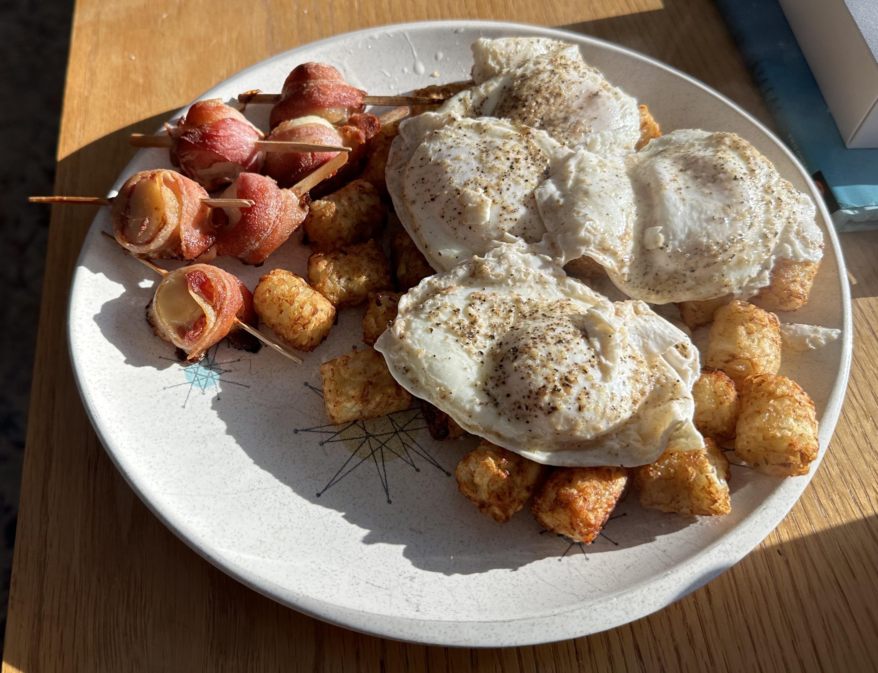 Bacon wrapped scallops from ALDI, tater tots from Trader Joe’s, and poached eggs. Delicious!by Mystical_Cat Write A CommentYou must be logged in to post a comment.