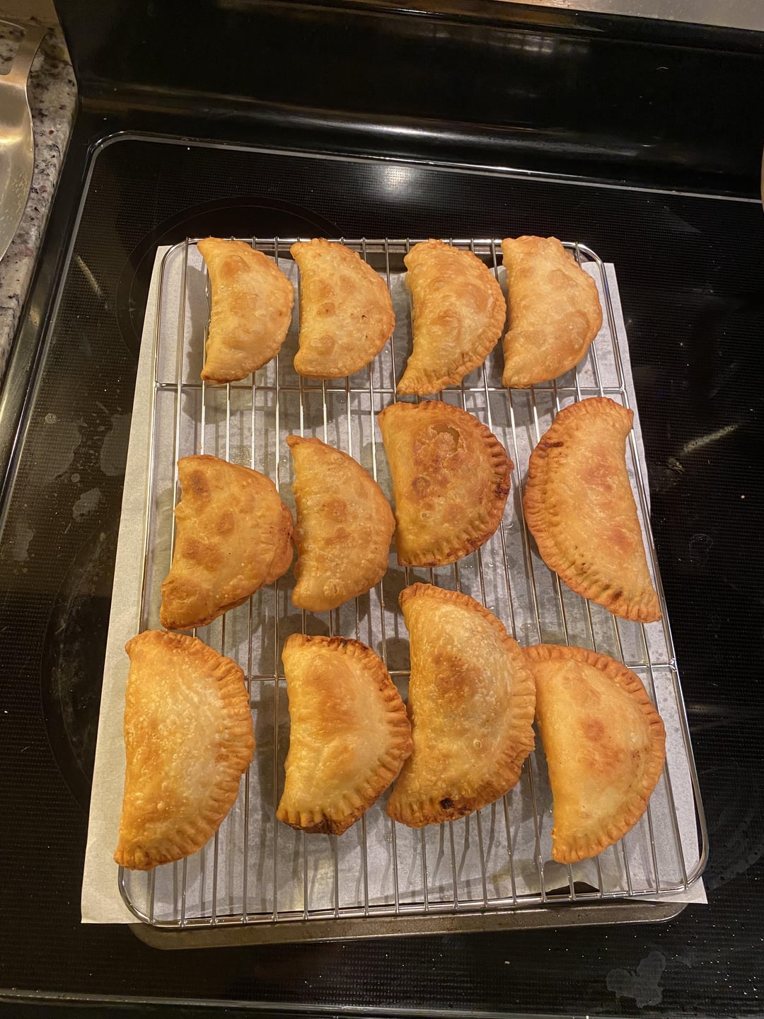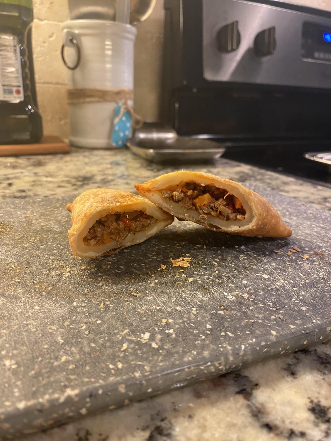 Filling is beef, carrots, jalapeños, bell pepper, onion, garlic sautéed then finished simmering in tomato purée and chicken stock. Used cumin, Spanish paprika, chili de arbol powder and bay leaves + S&P.