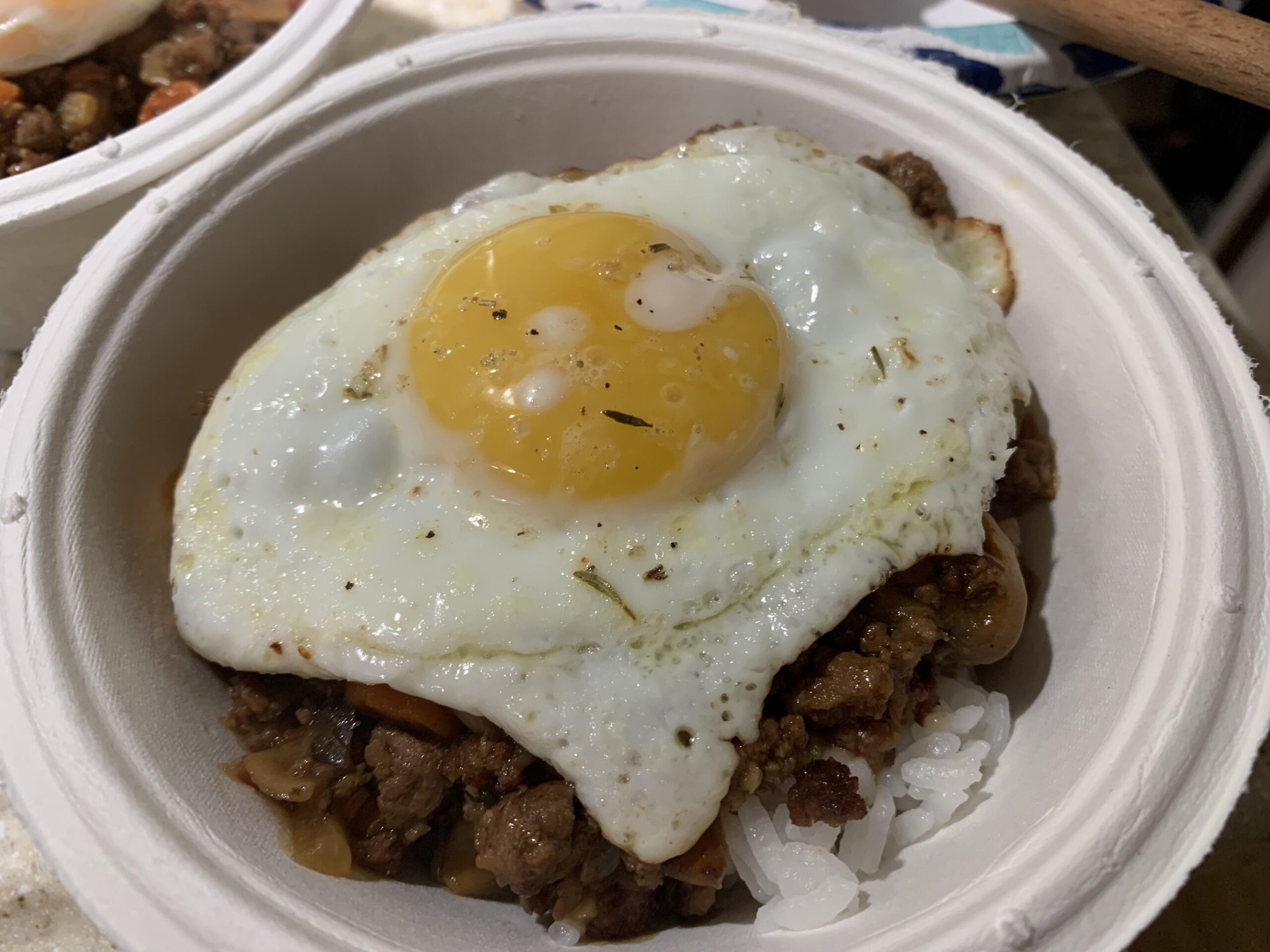 In large pan, break up and cook ground beef, season well. When meat is cooked but most of liquid has evaporated, remove most of the rendered fat, leaving ~4tbsp. Add onions and cook a few minutes until more translucent. Add the rest of the veggies and cook until liquid evaporates and everything starts to brown up and get some color. Add flour and mix well, cook for a few minutes. Incorporate water while stirring, to break up any clumps of flour. Season with Worcestershire sauce and dark soy (I usually use dark soy for the color). Adjust with more house seasoning to taste. Liquid can be adjusted with more water or evaporating. Serve over white rice, with a “poppy egg” on top.