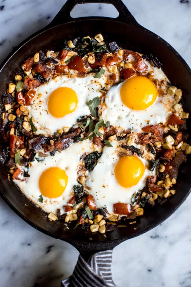 1. Heat oil in a skillet or frying pan over medium heat. When the pan is hot, add onions and sauté for about 2 to 3 minutes. 2. Add garlic and a pinch of salt and sauté for 30 seconds. Add corn and kale. When the kale has started to wilt, add tomatoes, and cook for a minute or two. 3. Stir in the sumac and ras el hanout. **You can also substitute these spices for whatever spices you have on hand.** 4. Move the vegetables in the pan to create 4 wells for the eggs. Crack an egg into each well. 5. Reduce heat to low and cover the skillet with a lid. Cook the eggs until the whites are set, about 4 to 5 minutes. 6. Check the eggs constantly to make sure that you don’t overcook them. If you want sunny side up eggs, you can separate the egg whites from the yolk when you crack the egg. 7. Drop the egg whites in one of the wells on the pan. Next, add the yolk on top immediately afterwards. 8. Turn off the heat. Add more salt and pepper if you like. Serve with a side of potatoes or bread.