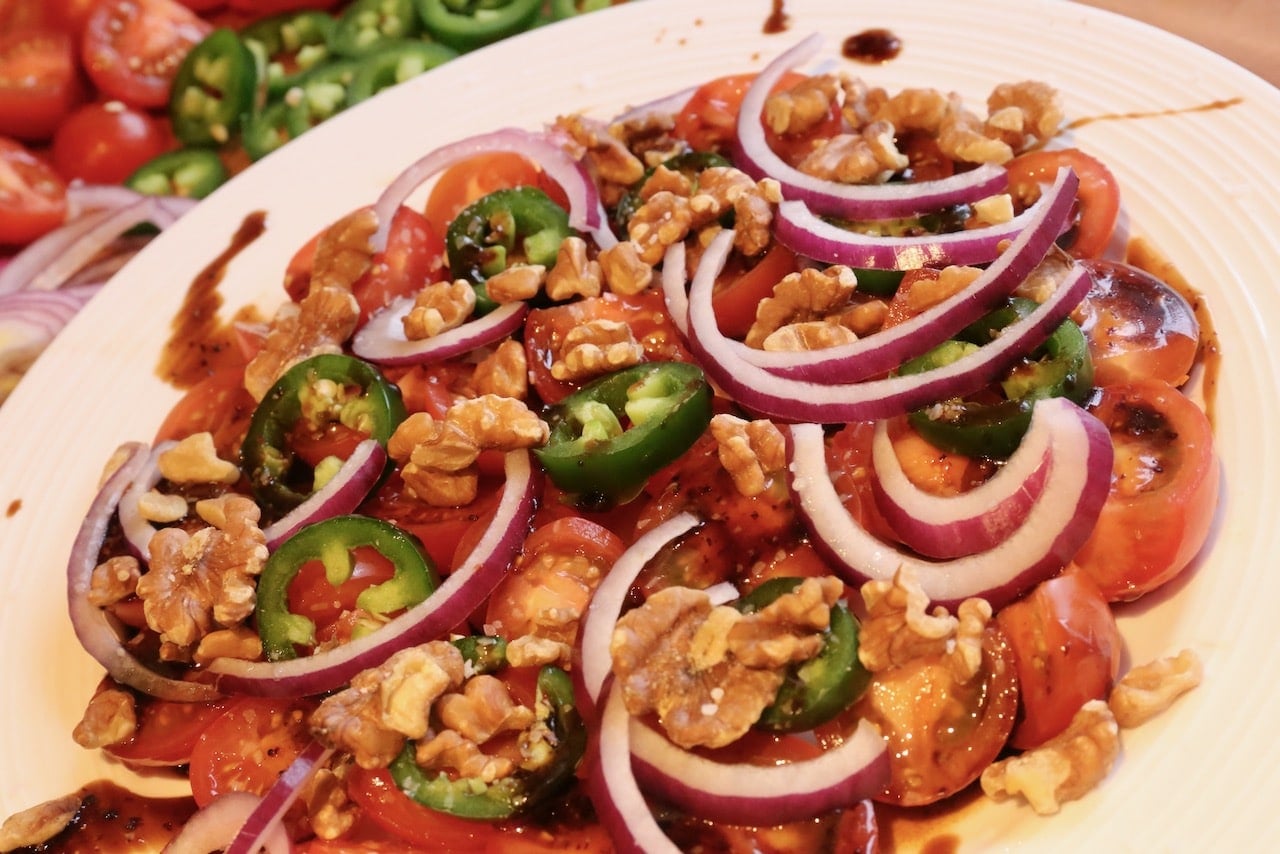 **Instructions** 1. Arrange the sliced tomatoes, pepper rings, and onion on a large serving plate. 2. In a small mixing bowl combine the sumac, pomegranate molasses, salt and olive oil. 3. Mix until well combined. 4. Drizzle the dressing evenly over the salad. Garnish with walnuts and a sprinkling of sumac and salt.