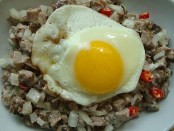Sisig (chopped pig parts and chicken livers tossed with a spicy and sour dressing) with eggby funkocom Write A CommentYou must be logged in to post a comment.