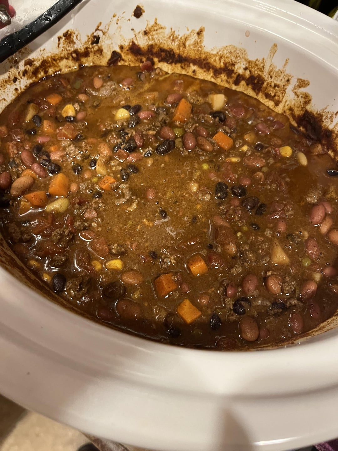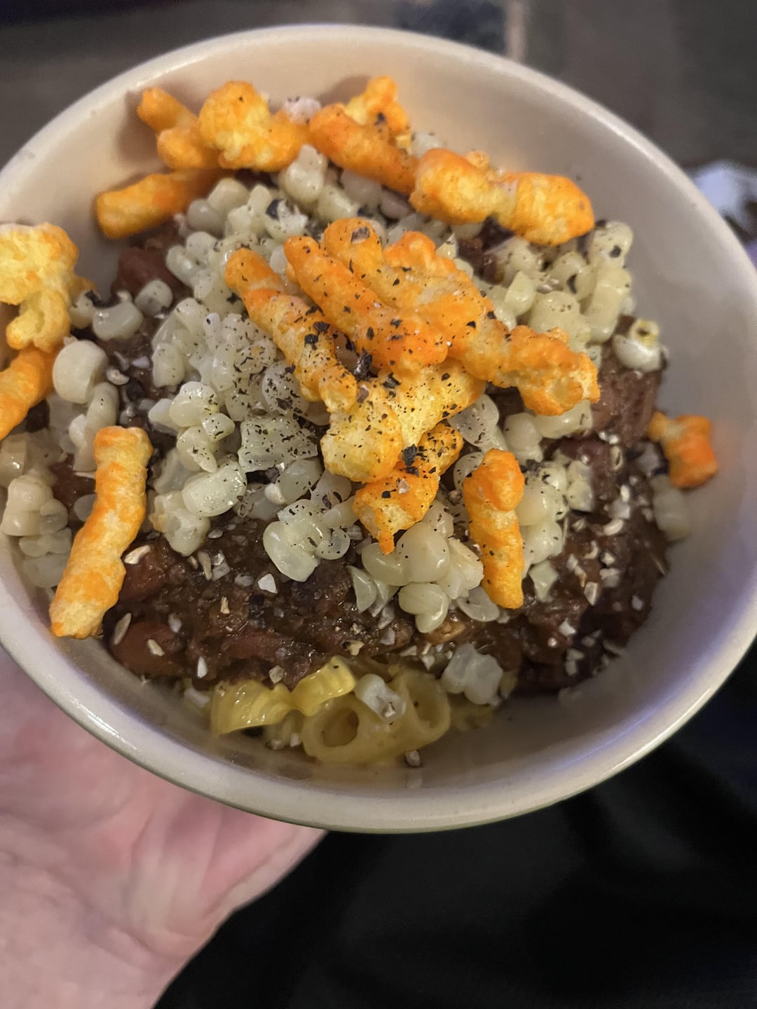 Slow cooker Venison and bacon chili on Mac n cheese with homegrown corn and Cheetos on top