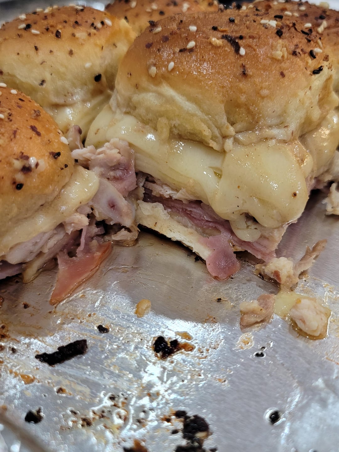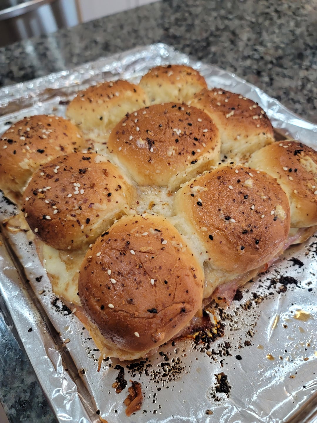Ordinary_Funk8 3 years ago Recipe:Hawaiian Rolls, Ham, Pulled Pork (smoked for 8hrs), Swiss CheeseSpread Mix (Inside of Rolls), Butter (melted and cooled), Dijon Mustard, Worcestershire,Topping Sauce Mix, Butter, Minced garlic and onion, Sea salt
