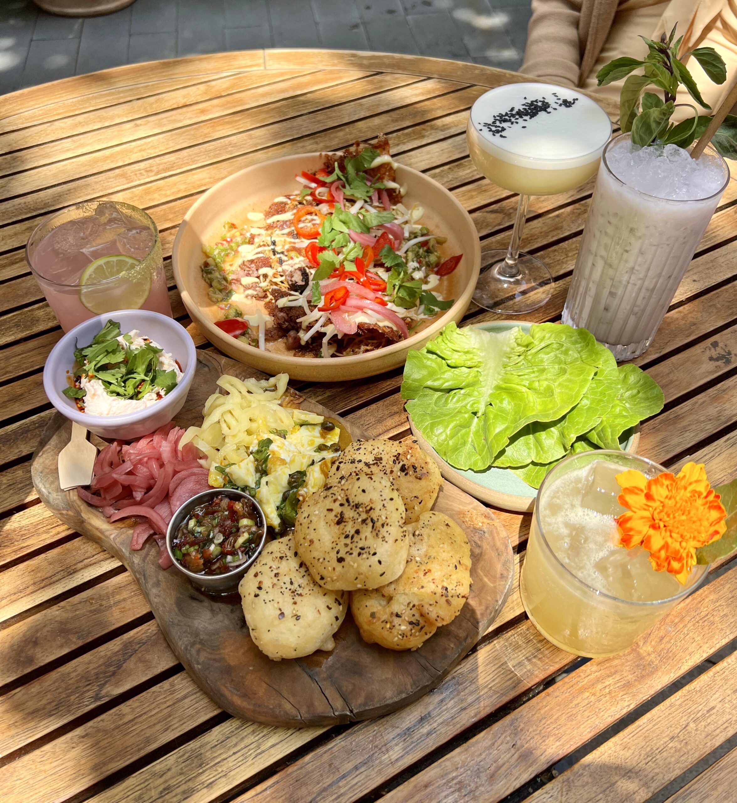 The dough balls at the bottom are used on three dishes. This is a savory dinner entree. Exact same prep minus the sesame seeds and spice are a brunch option with a salmon spread (think Underwood chicken). Third is their dessert donuts.