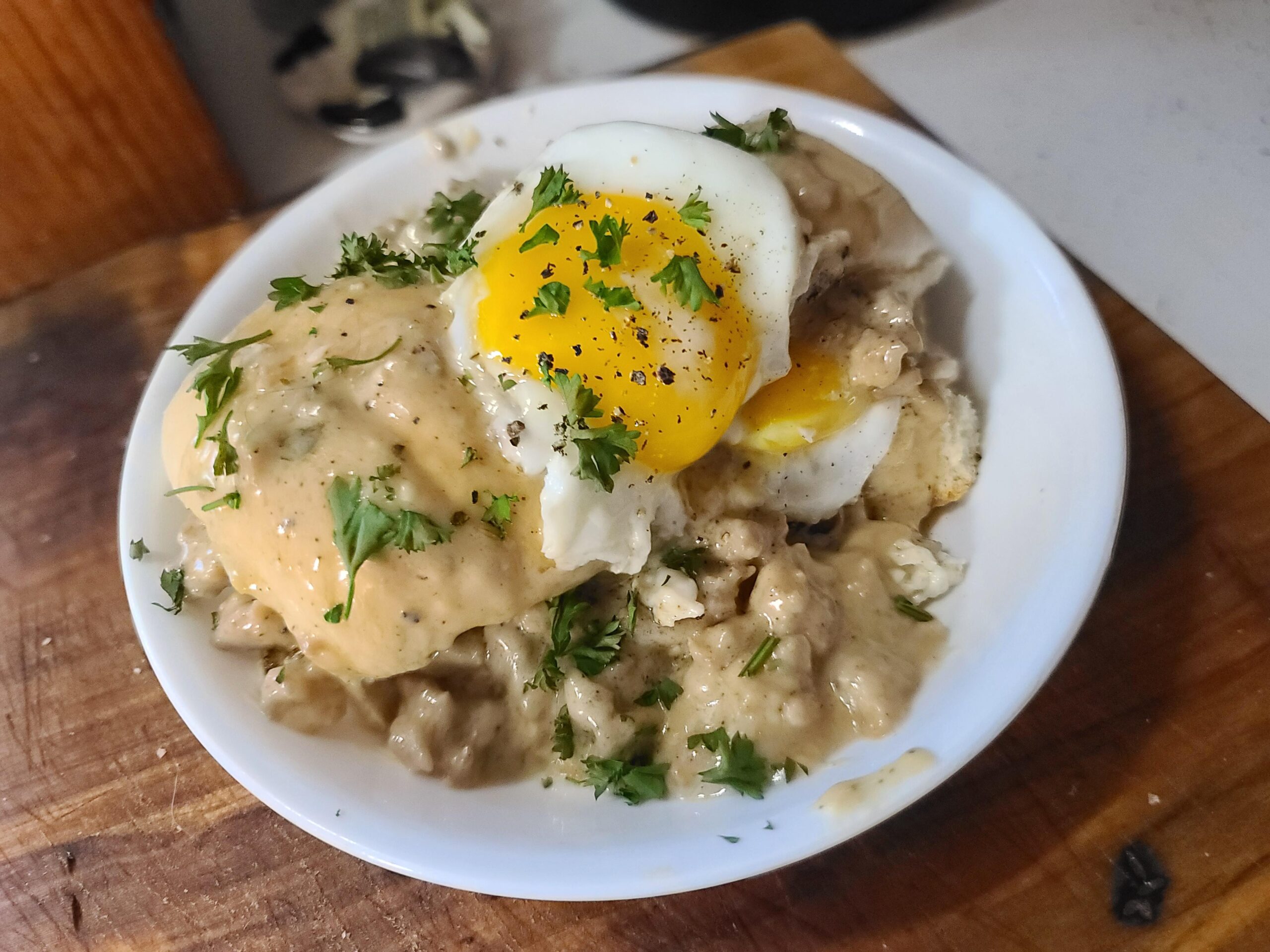 PhilipJFried 3 years ago Yes! I used to eat at a cafe that covered an open biscuit with scrambled eggs and gravy. So good.