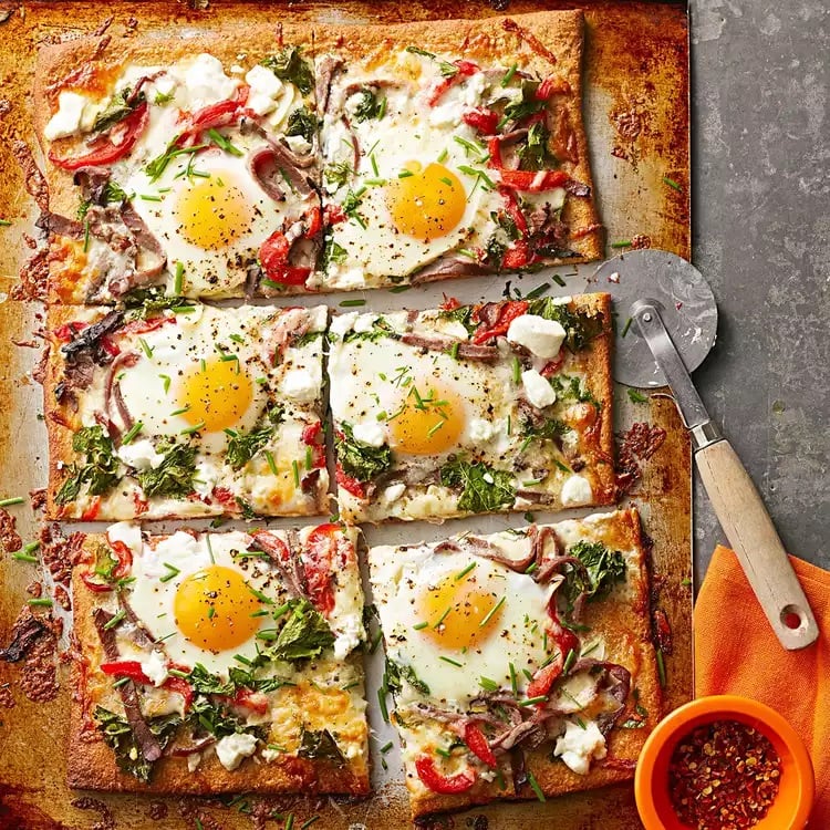 You won’t find a pizza like this at your local fast food restaurant. Roast beef, fresh kale, eggs, and goat cheese are the mouthwatering toppings that make this pizza recipe special.