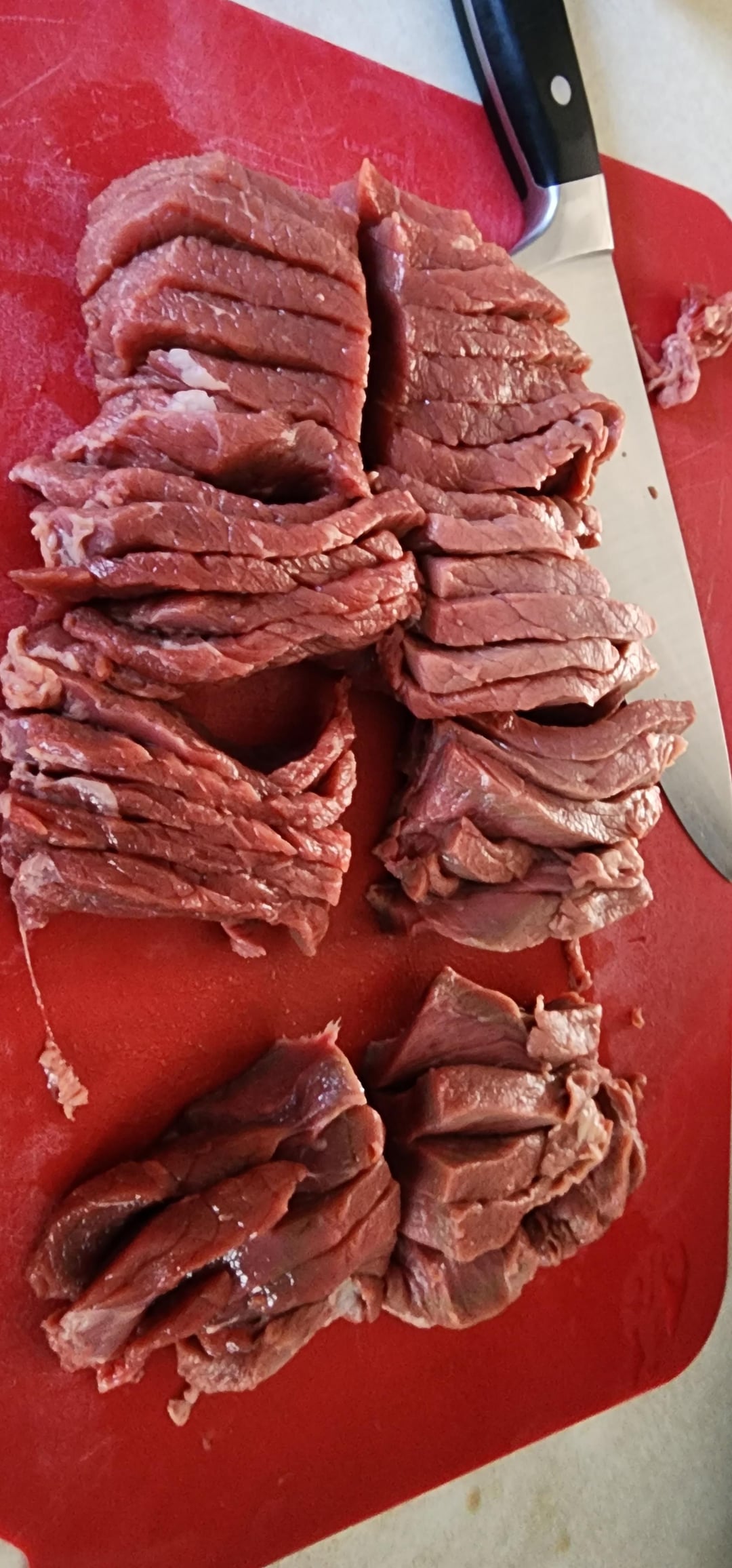 2. Cut the entire slab of meat into thin slices about 1cm (1/4″) wide and 7cm (2.5″ – 3.0″) long and place it in the crock pot.
