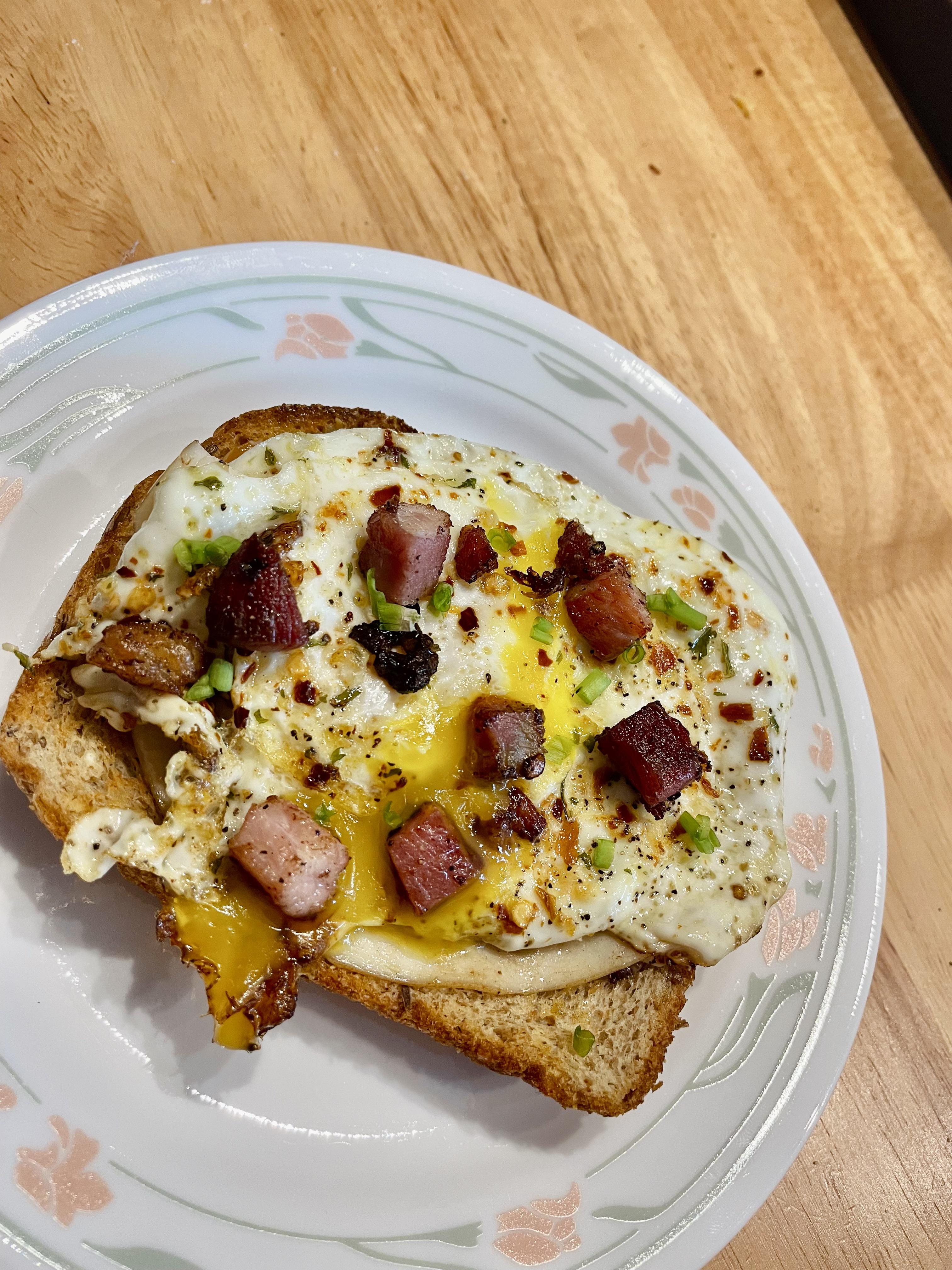 Burger-Burglar 3 years ago Btw folks what is shown here is ;Weird a$$ Belgian wheat bread (toasted)TurkeyProvolone cheeseEgg topped with cayenne flakes, green onions, some Italian aglio and other spices Cooked for most part in the Italian pancetta fat / olive oil.Salute