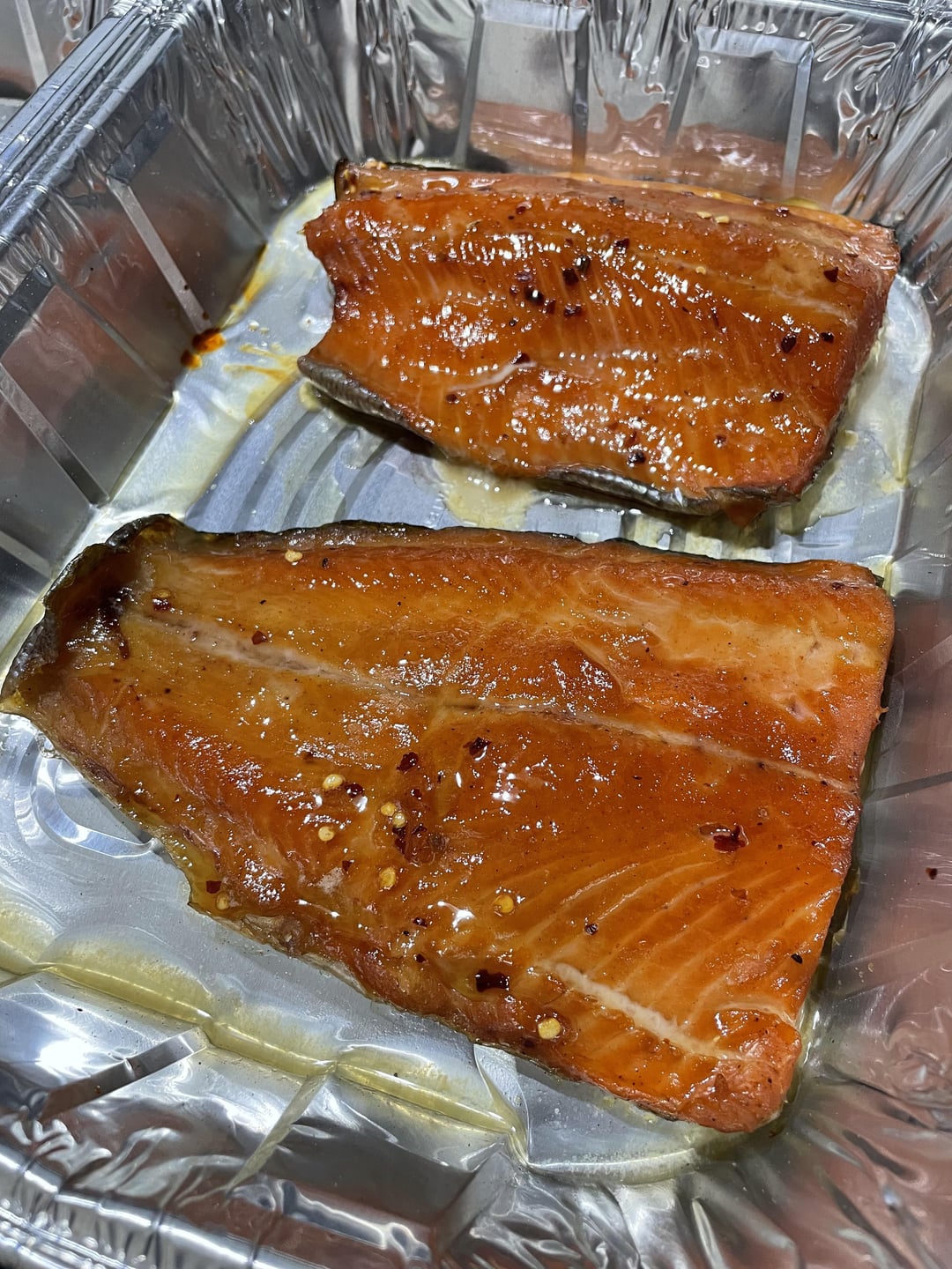 Went fishing Thursday and caught a nice one, filleted it, cured it over night and smoked till 150 (I take it a bit higher), finished with a brushing of hot honey and red chilies.