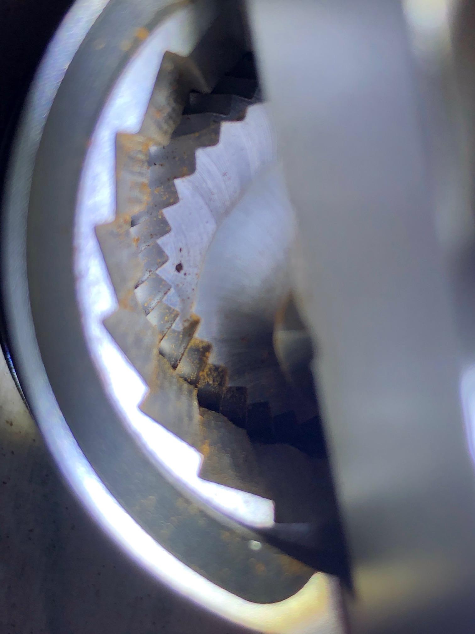 This is as much as I can shove my phone in without removing the burr completely. I can see further in and all the burr grooves that I can see are fine. The machine finishes of the flat non-grinding surfaces are rough though and it doesn’t look like they polished them, but these have no bearing on the grind. The burr material looks different from https://www.reddit.com/r/Coffee/comments/13fc2ci/1zpresso_jxpro_burrs_after_12_months, of which my post is a follow up on. Maybe they started using a cheaper material. Anyway, my burrs are still fine after 3 years. I’ve considered upgrading to a bigger grinder several times, but I’m satisfied with mine and if it ain’t broken, why replace it?