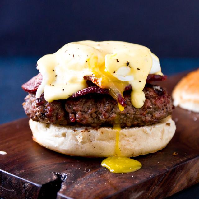 Crispy bacon, a poached egg, and hollandaise sauce top this dinner-meets-breakfast burger.