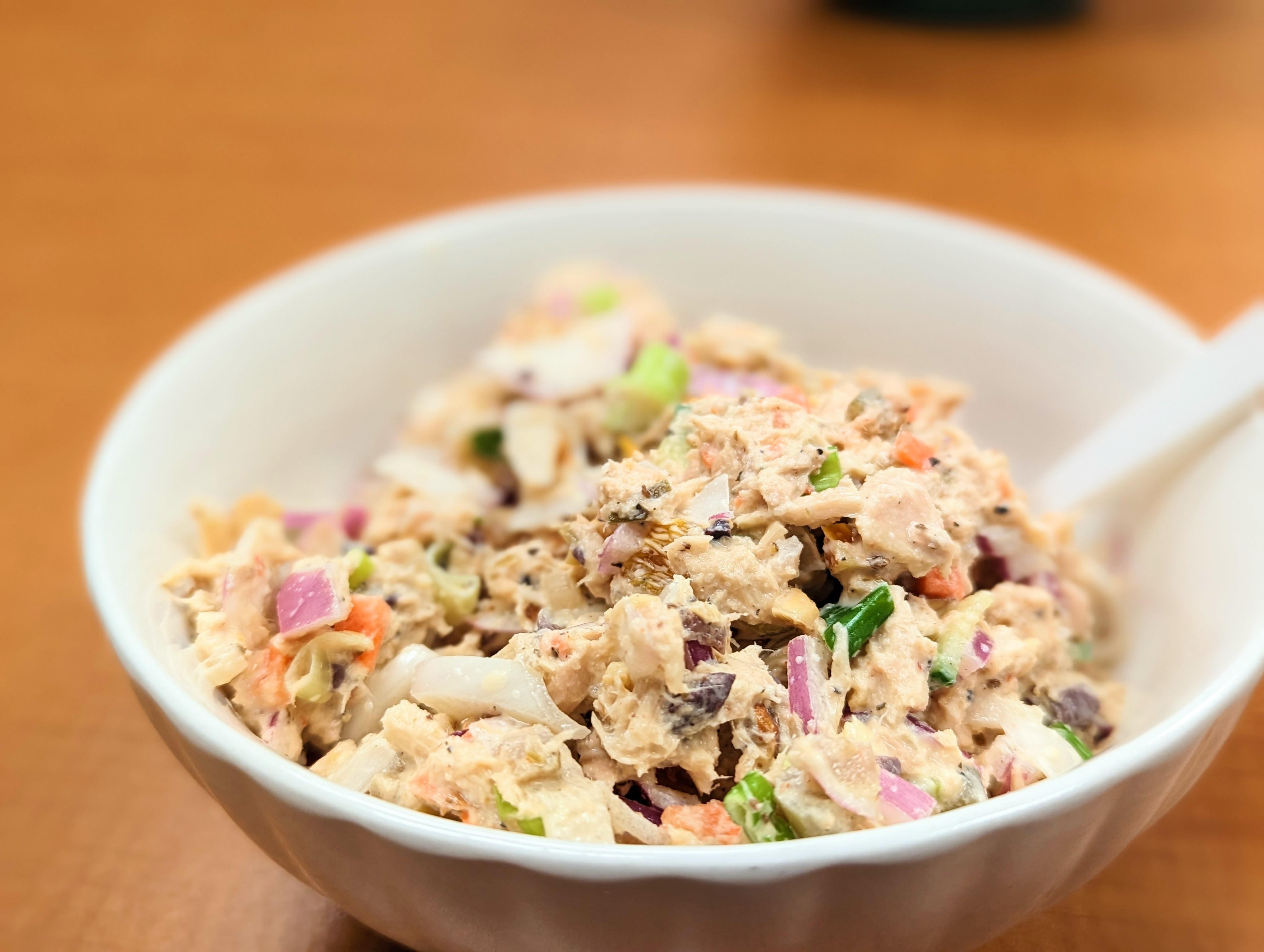 – 1 can low sodium tuna – 1/2 red onion, finely chopped – 1 clove of garlic, minced – Salt and pepper, to taste – 1/2 teaspoon onion powder – 1/2 teaspoon garlic powder – 1/2 teaspoon paprika – Splash of olive oil – 4 olives, diced – Half a mini cucumber – 1/2 carrot, diced or grated – 1/2 pickle, finely chopped – Fresh dill, chopped (to your preference) – 1/2 teaspoon celery seed – 1 fermented jalapeño pepper, seeded and finely chopped (can substitute 1 tsp red pepper flakes and a splash of tobasco if you have it, as tabasco is a fermented sauce and will have the “funk”) – Pickled banana peppers, to taste (sliced or chopped) – 1 fermented bell pepper, seeded and finely chopped – 1/3 cup mayo (I added a spoonful at a time until it looked right) – 1 Tablespoom cashews, chopped – 1 Tablespoon almonds, chopped