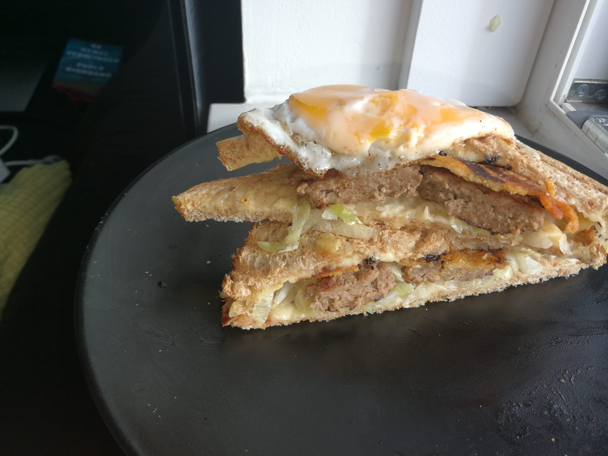 Patty melt with lettuce and also some crunchy cheese (more in the comments) with an egg on top!