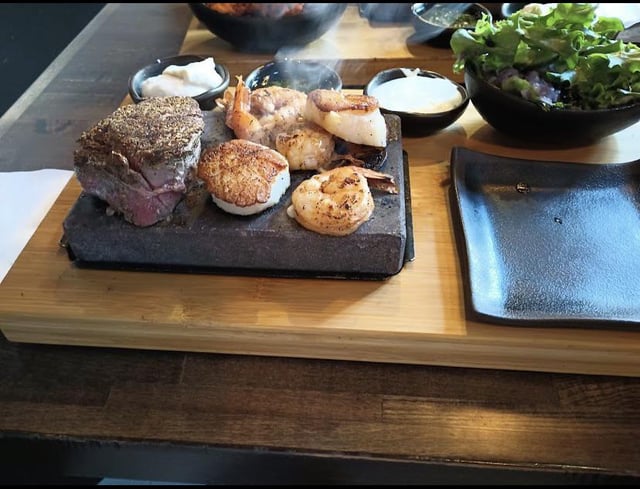 These look like “cooking stones” (I’m sorry, I don’t know the proper name). If so, they come sizzling hot with raw protein on or next to them as you’re meant to cook to your own preference.
