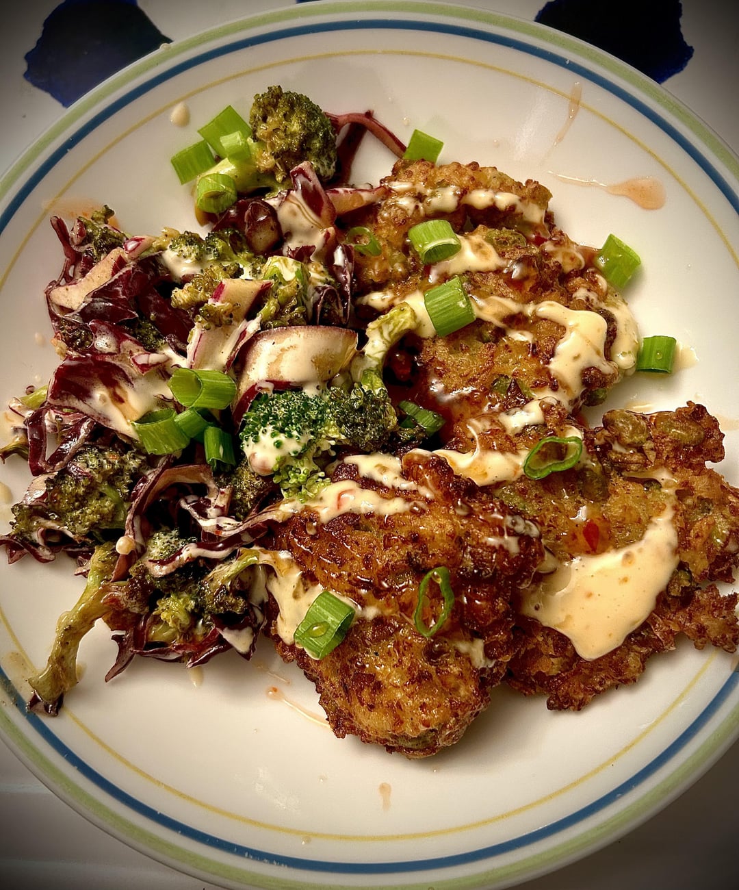 Edamame & Cauliflower Fritters w/ roasted broccoli slaw 😋 10/10