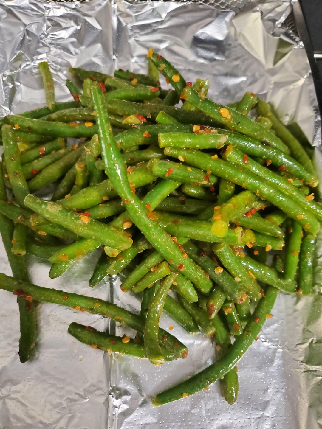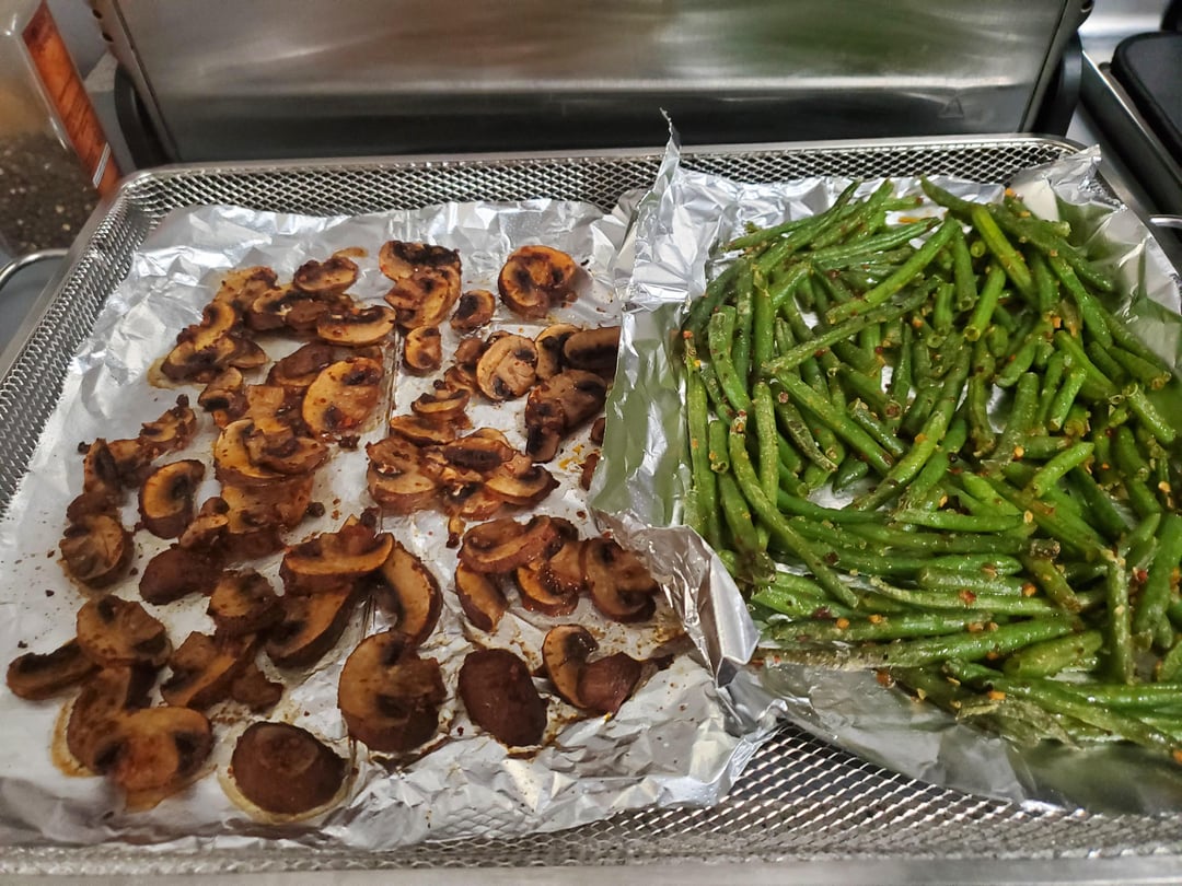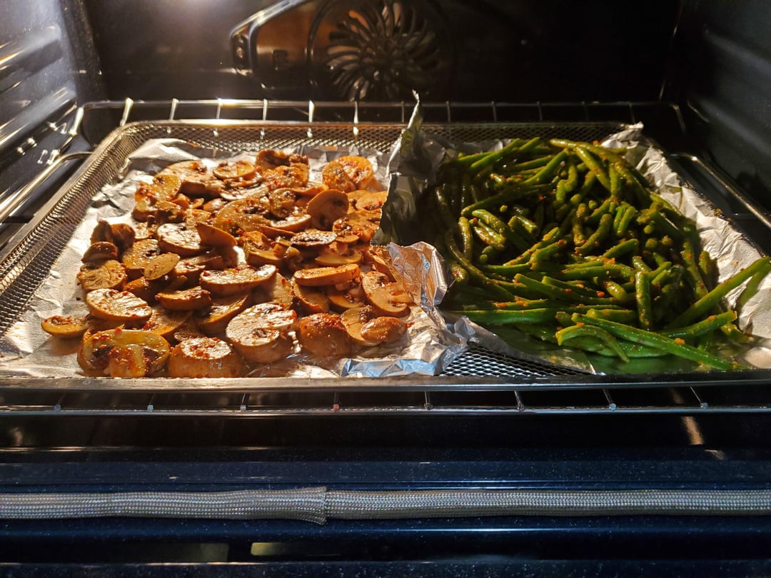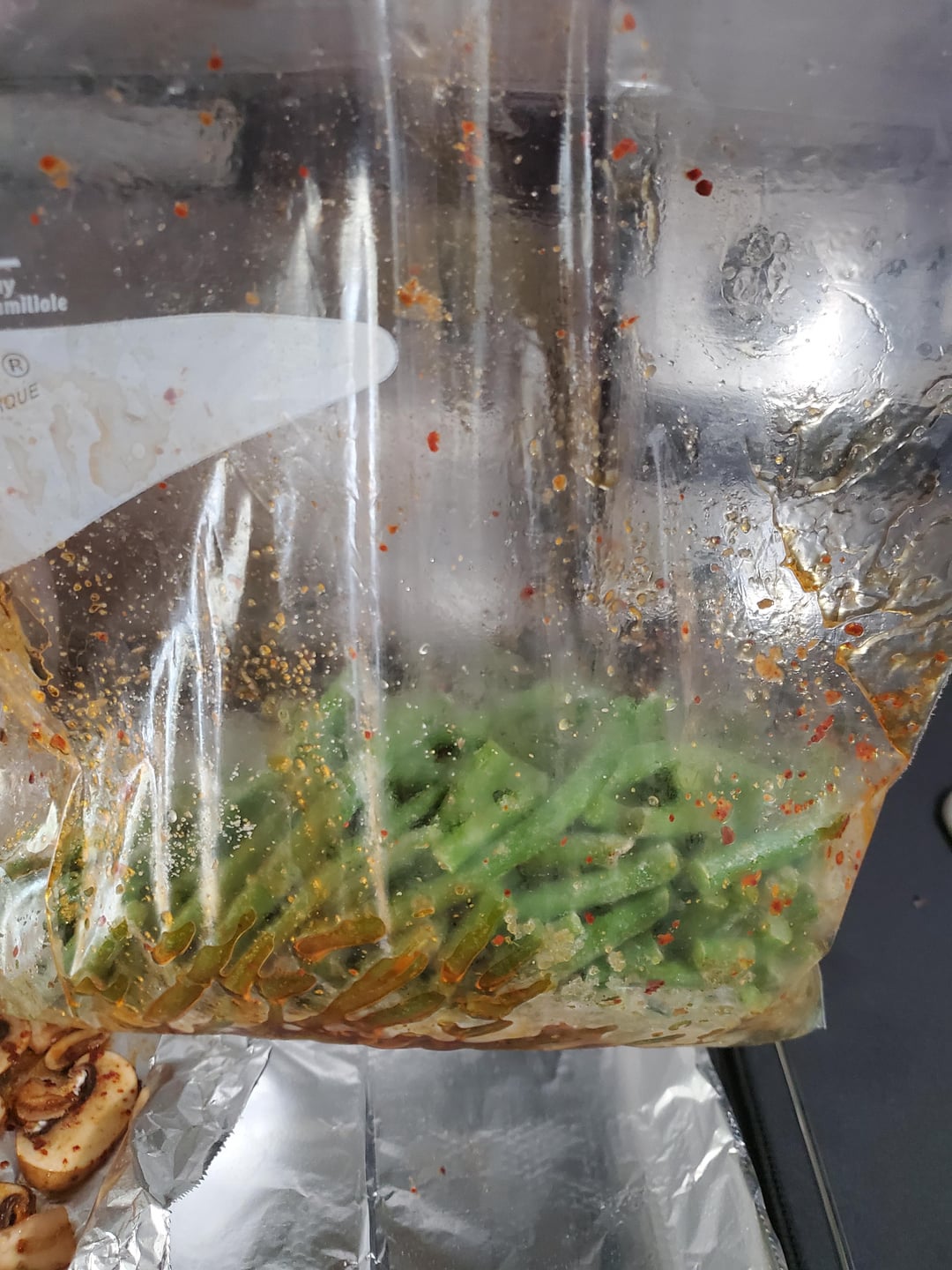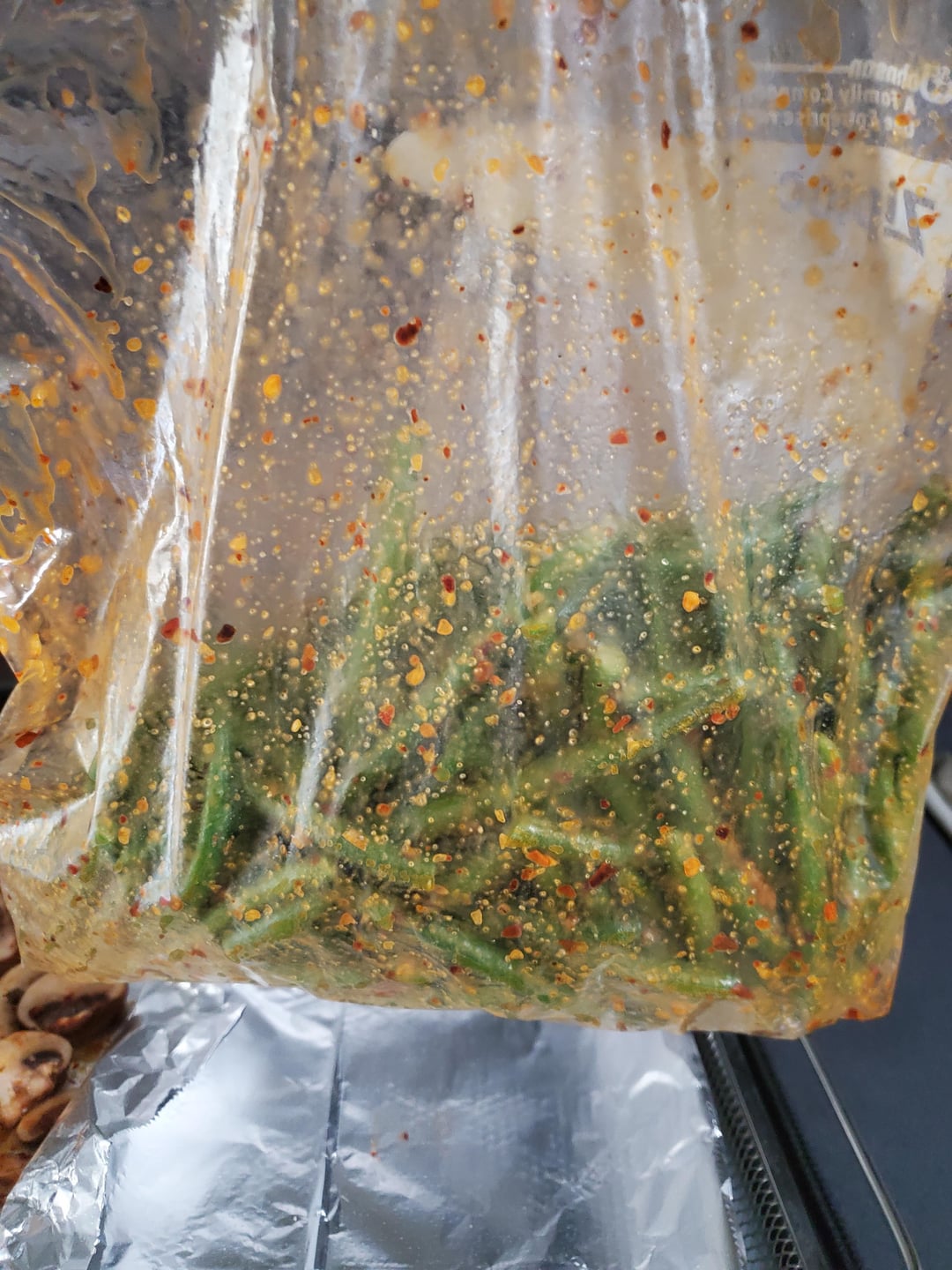 Using a ziplock bag and the “shake & bake” method to roast veggies/proteins is fast, distributes the oil/seasonings evenly and reduces clean up time. Add your desired ingredients to a large bag leaving enough room to seal and move the contents around. Then just dump and spread out on a baking tray