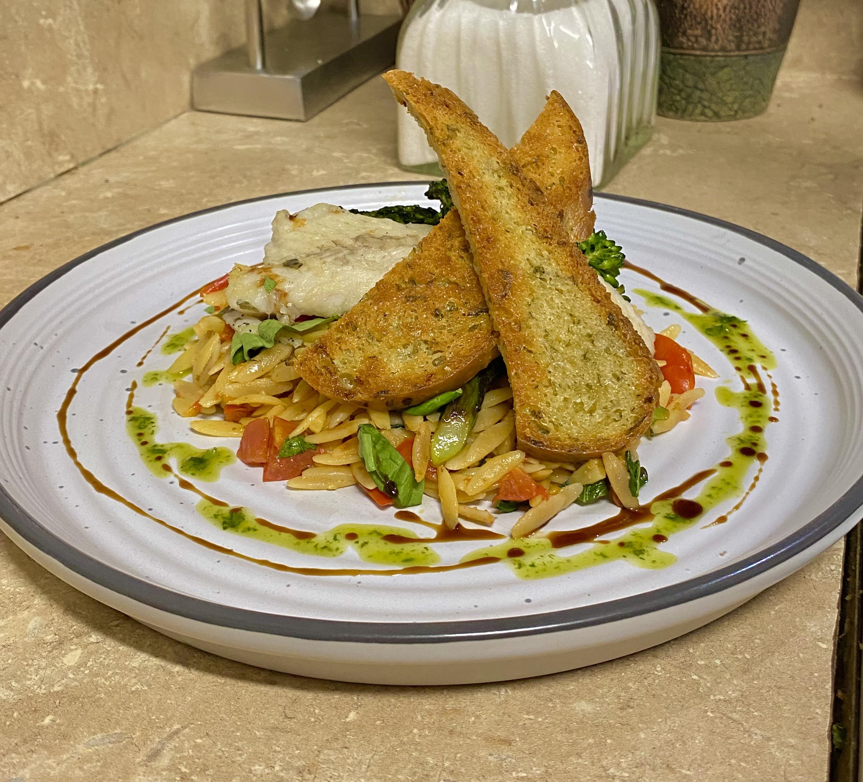 On today’s episode of roast my dinner, I have chive and orange peel poached flounder, orzo tossed with olive oil fresh basil and cherry tomato, parsley and onion sour dough toast, 17 year balsamic and basil oil.