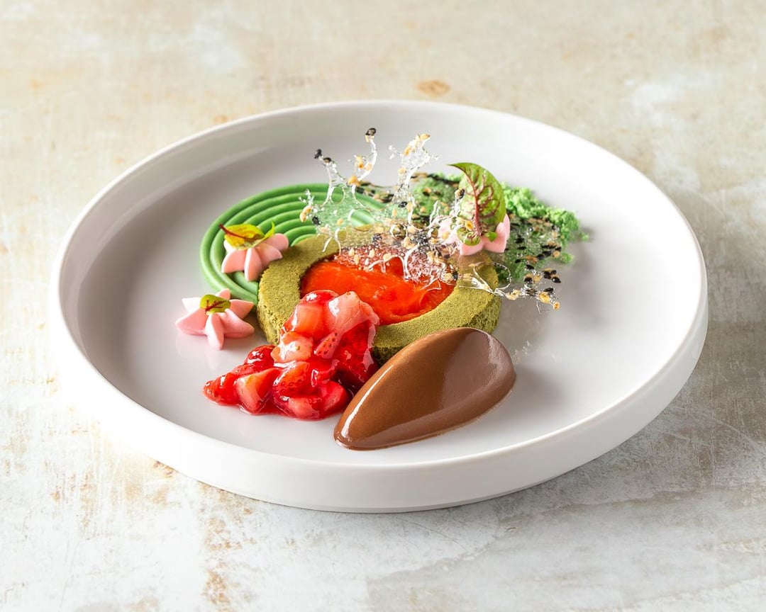 Chocolate Crémeux with Brown Butter Gochujang Caramel, Matcha Sponge, Matcha White Chocolate Ganache, and Toasted Sesame Isomalt Tuile