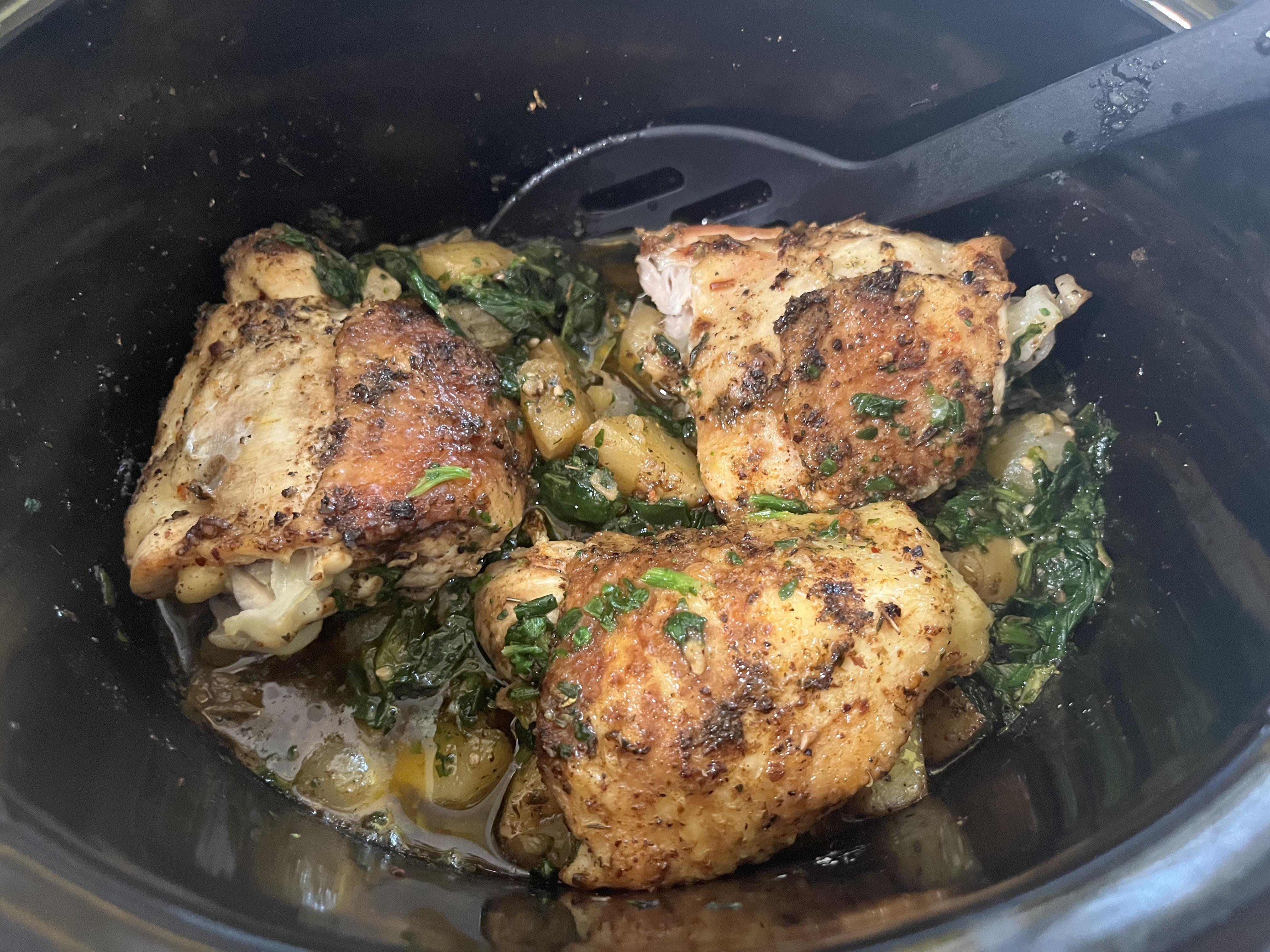 A “threw it together” meal of garlicky chicken, potatoes, and spinach