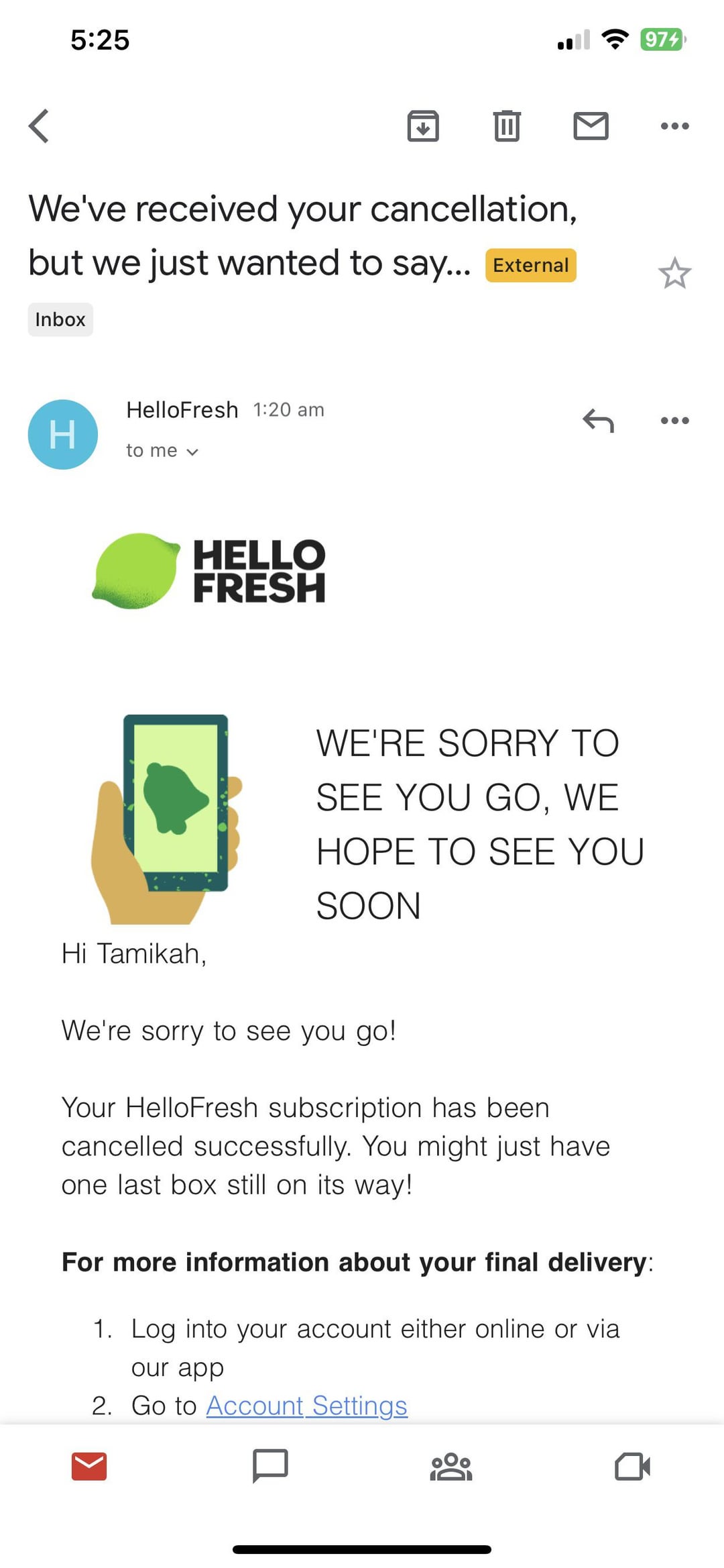 I’m due to have my first hello fresh box delivered on Sunday (28/5/2023) which is free apart from $9.99 shipping. I’ve just woken up to this email saying that they have received my cancellation but I didn’t cancel my plan??