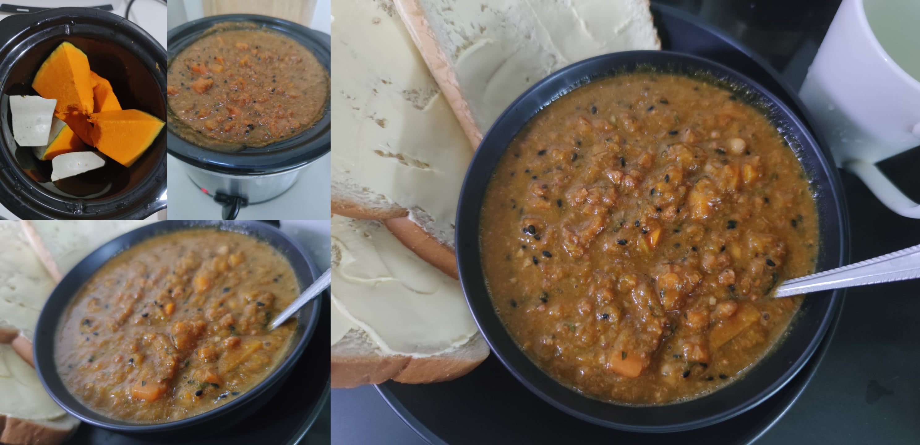 Crown Pumpkin 575g slow cooked on high for 1¾ hours (1.5 litre Slow Cooker) with 2 cut carrots. Stopped slow cooking and separated out pumpkin for skin removal and mashing, carrots were diced. Added back to Slow Cooker with half of the original liquid. Cinnamon 2tsp, cajun spice 3tsp, black sesame seed 4tsp and tarragon 5tsp. There was also about a ⅓ can baked beans leftover added. Slow cooked for 1 more hour on high.